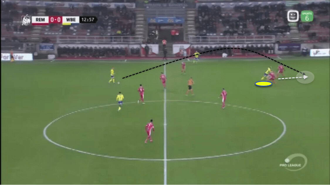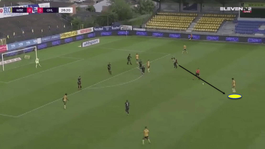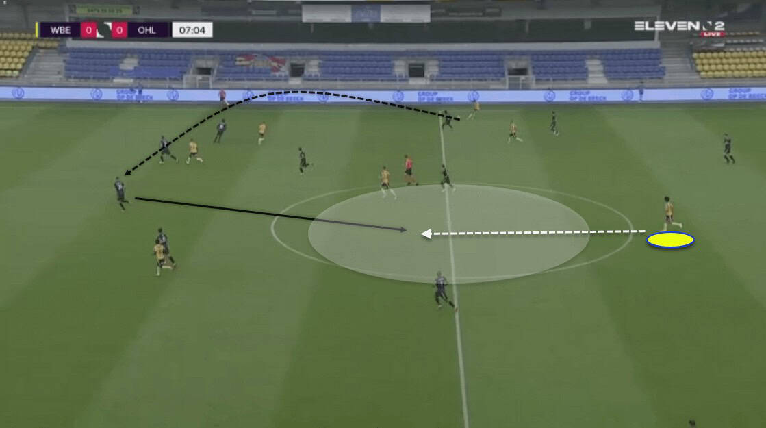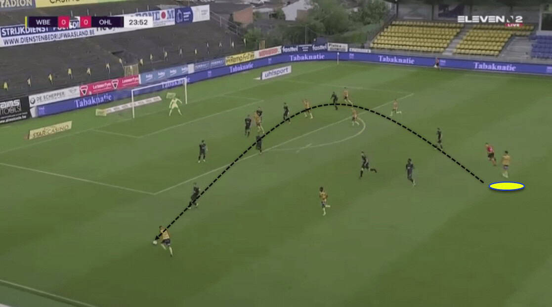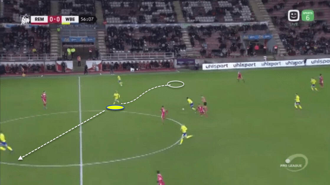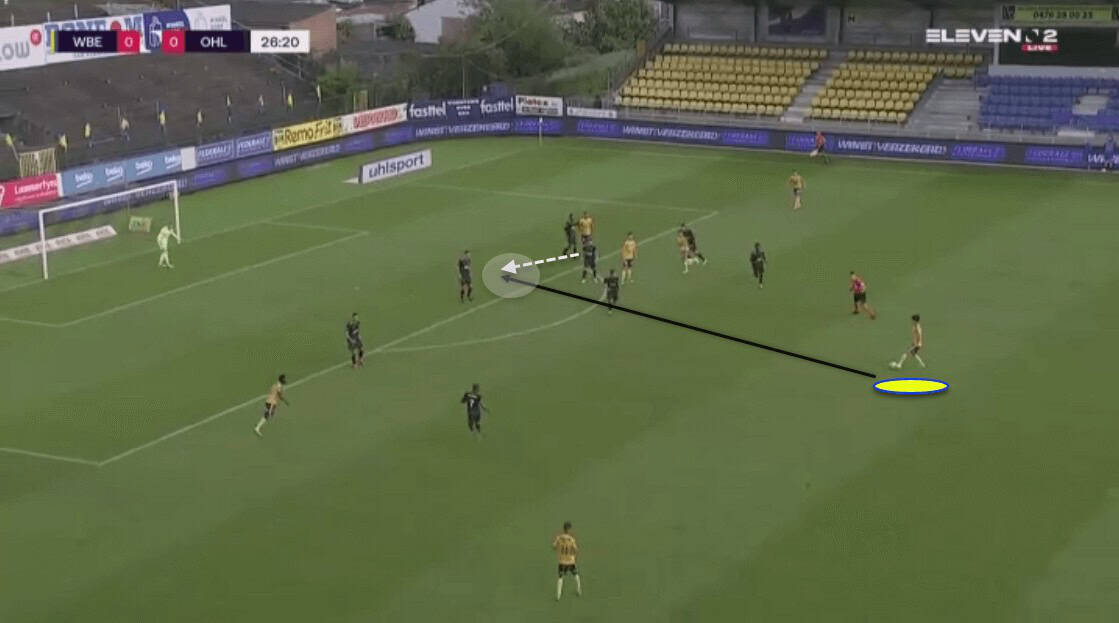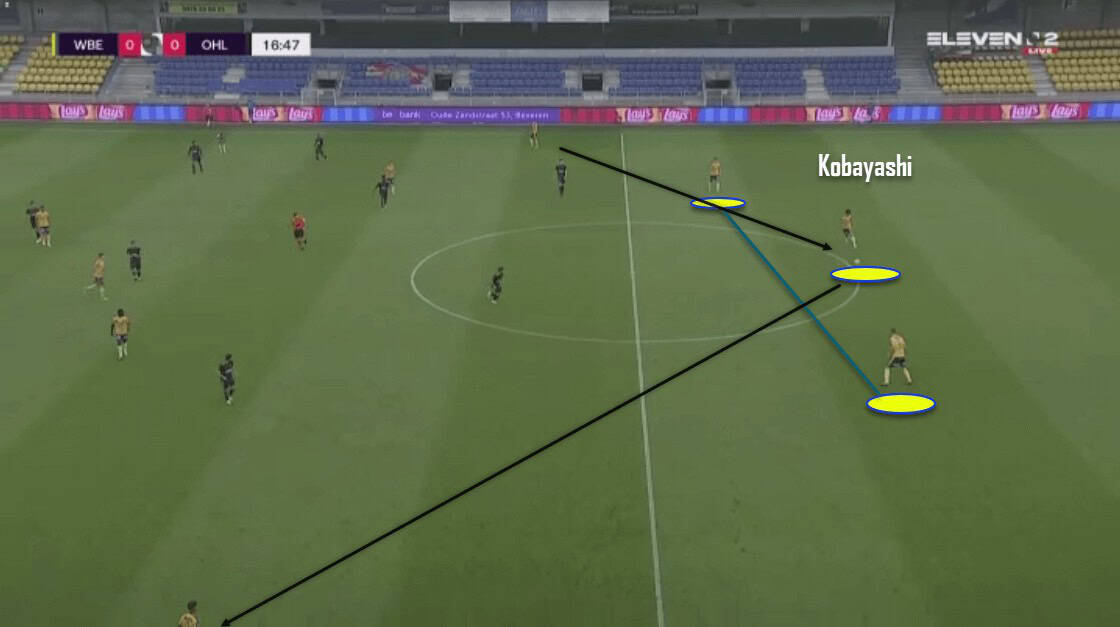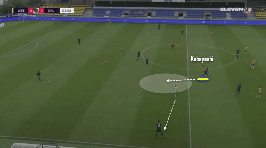 In one instance, Kobayashi receives the ball in a similar position and passes it to the wide player, who then has space to make runs forward and deliver a cross. This is a relatively indirect approach, but Kobayashi’s ability of detecting free players is on display here.