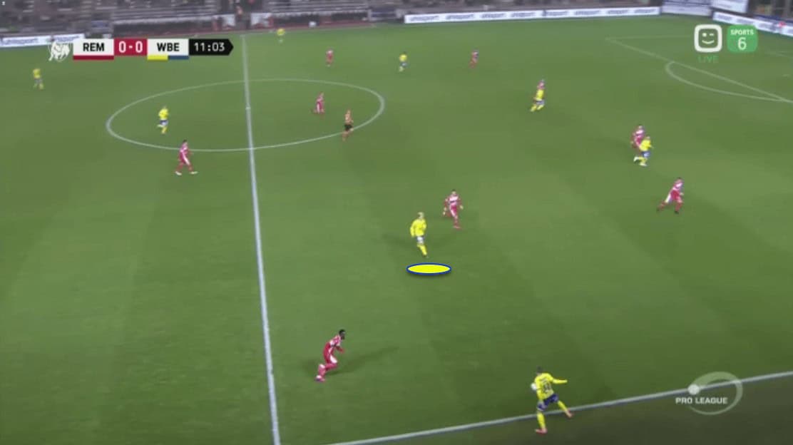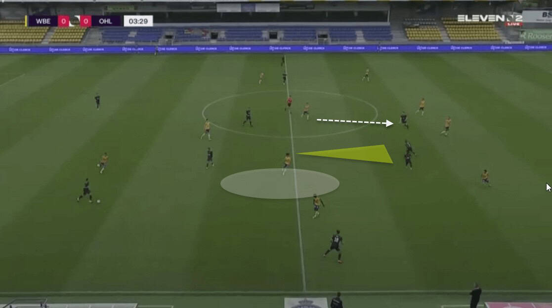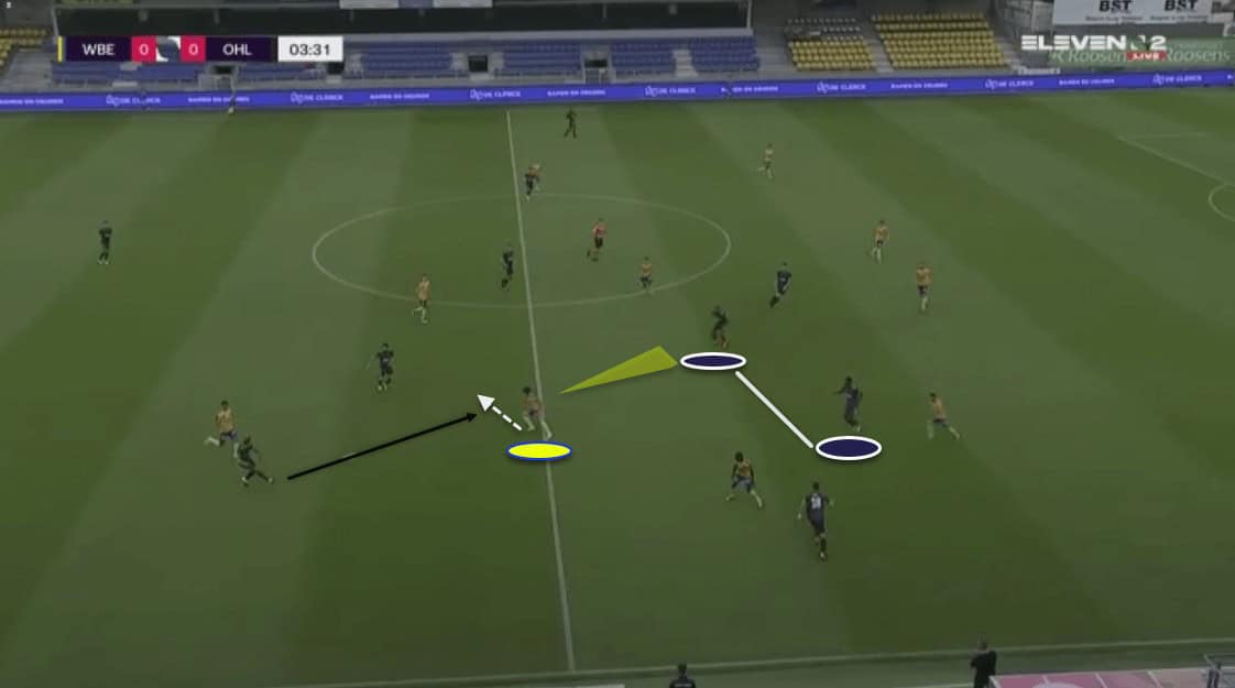 Similarly, Kobayashi prefers to get himself involved in the build-up by reaching out to spaces in his own half, as far as going on to the defensive line to look for spaces. One such instance is shown below: