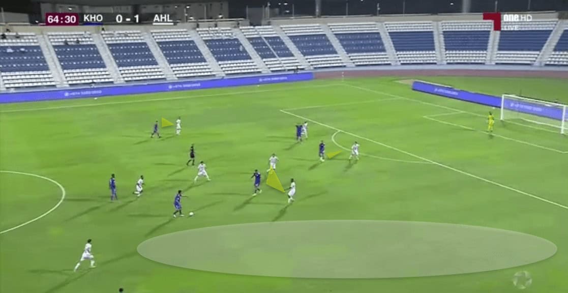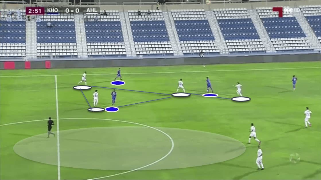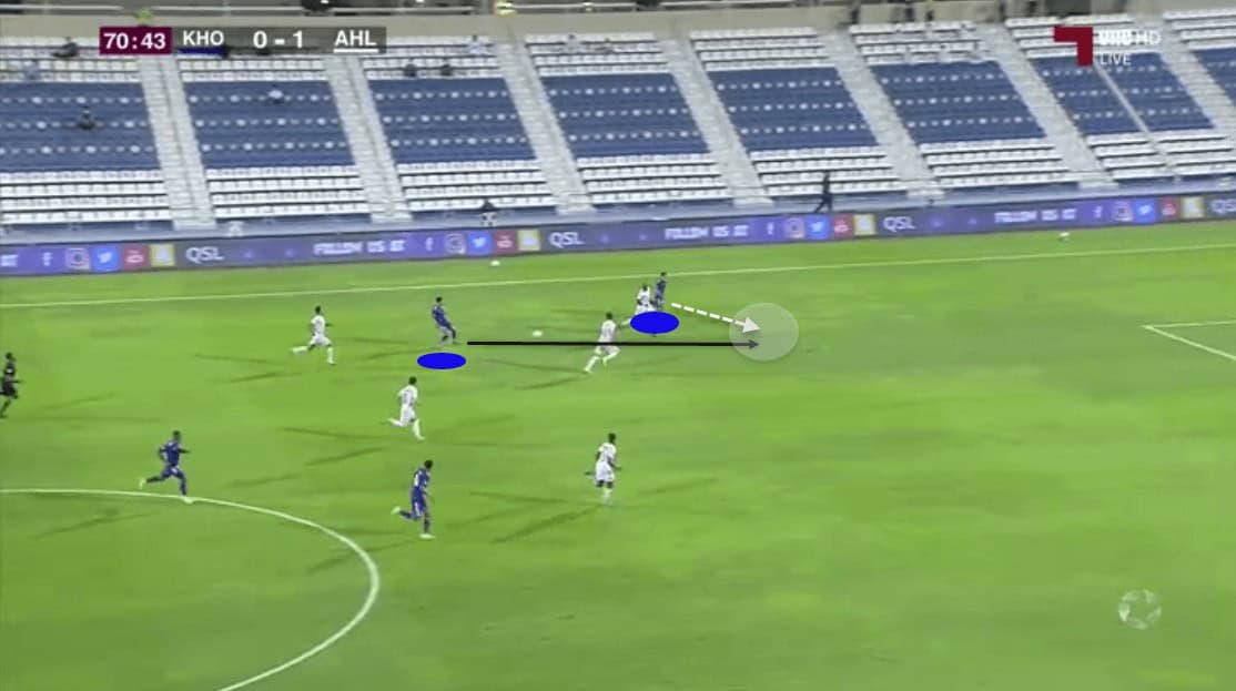 Taking a look at one instance from Al-Khor SC’s fixture against Al-Ahli, we can see Al-Khor’s weaknesses of not being able to spread the play via interchange of passes. This happens because of poor positioning towards the centre.