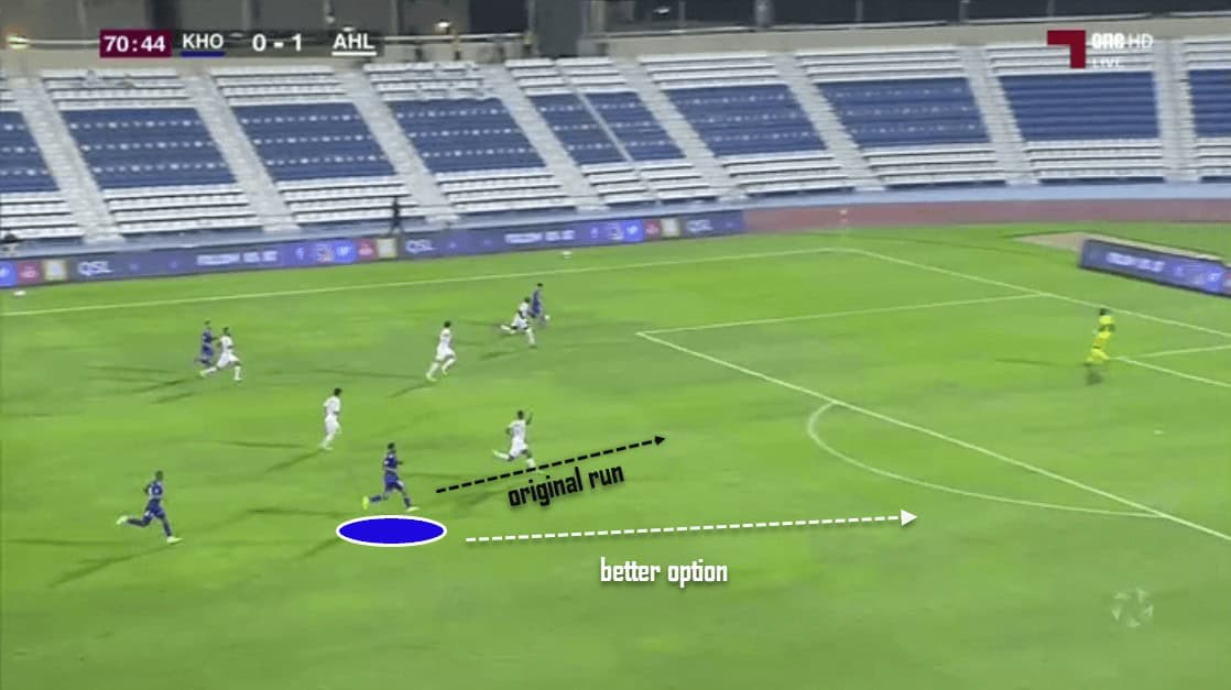 Taking a look at Al-Khor’s weaknesses, we can see two players making runs towards the centre as the wide player attempts to drift towards the half-space to receive. However, the move ends with none of the players getting towards central space. Instead, the defender’s task is made easy as the forward follows the defender in the process.