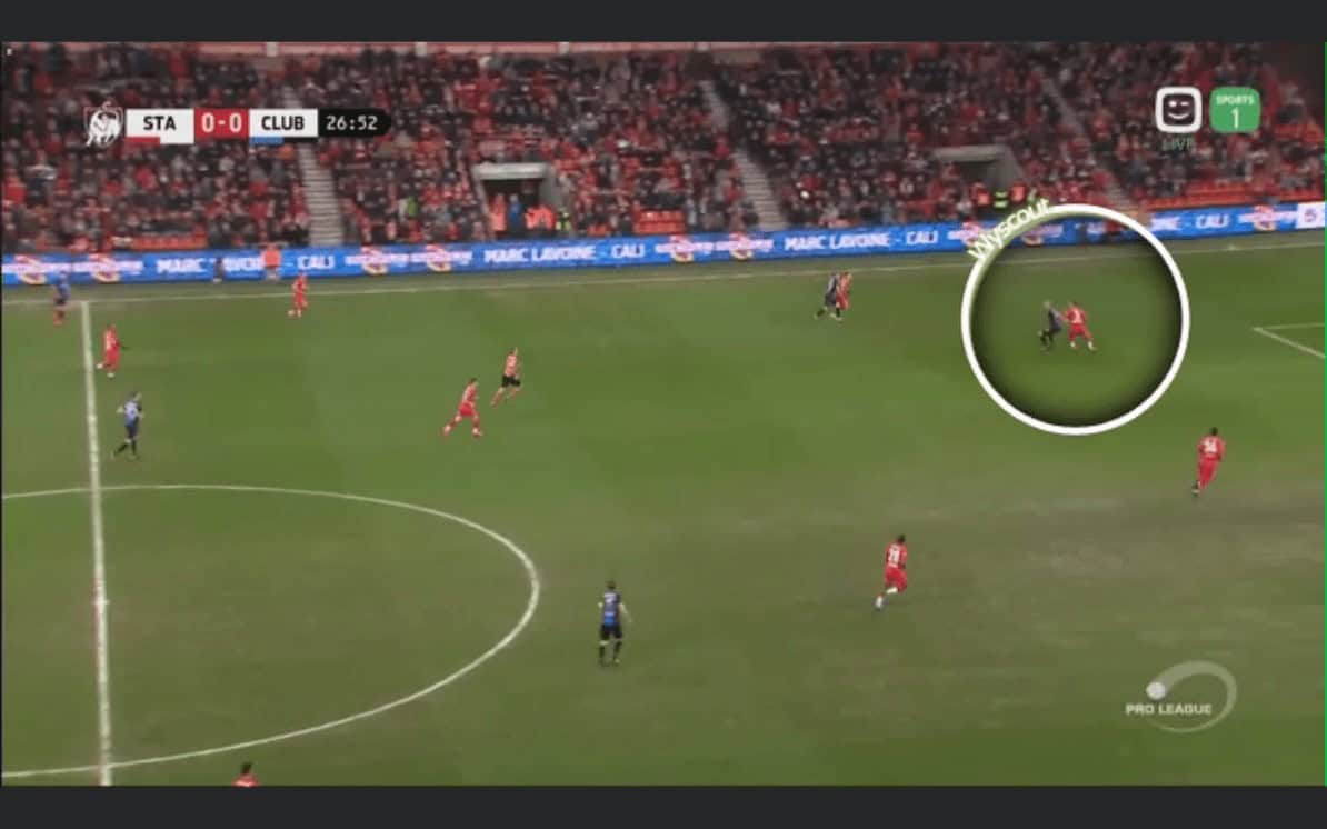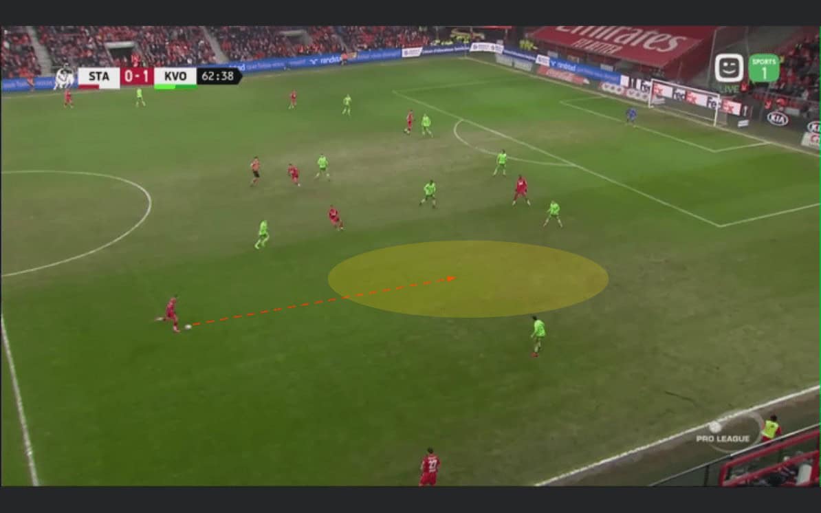 In the example below, Vanheusden sees the space behind Didier Lamkel Zé. This space is created by Vanheusden himself by driving with the ball forward and giving Lamkel Zé a decisional headache. Thus a 2v1 situation on the outside is created.