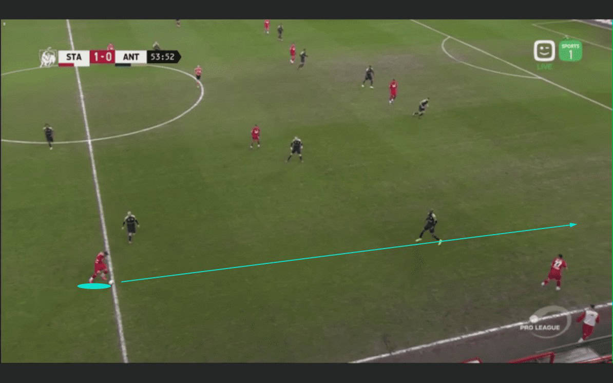As discussed above, Vanheusden’s passes are partly forward ones. Most of these forward passes are long passes. Preud’homme asked the Belgian centre-back last season to play long when the occasion occurred. Consequently, Vannheusden was a huge asset to Standard’s build-up play last season. Back then, the Belgian had an accuracy of around 60% when playing long passes. This shows he is reliable in this area of the game.