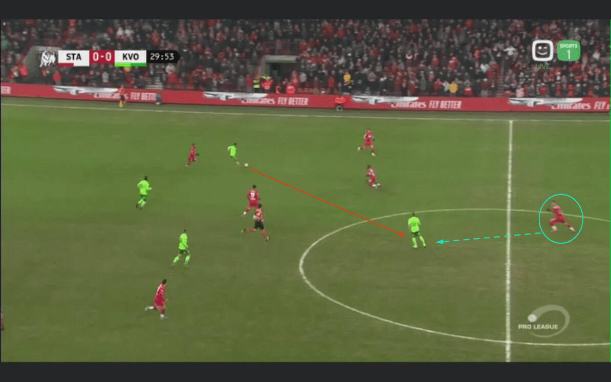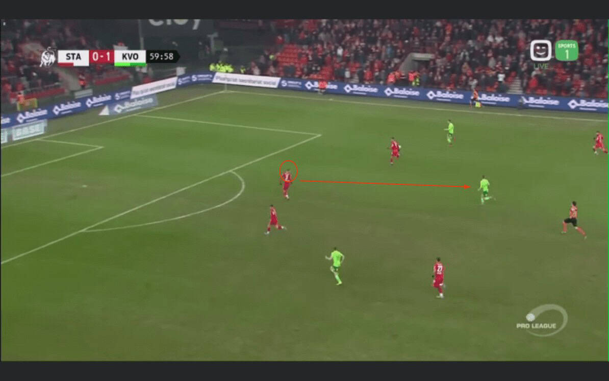 In the game below, a situation occurs where the Oostende forward can pull back the ball in front of Standard’s last line. Due to the Belgian’s body position, Vanheusden is able to perceive the ball carrier and the players in front of him at the same time. This gives him the option to intercept the ball instead of engaging into a defensive duel.