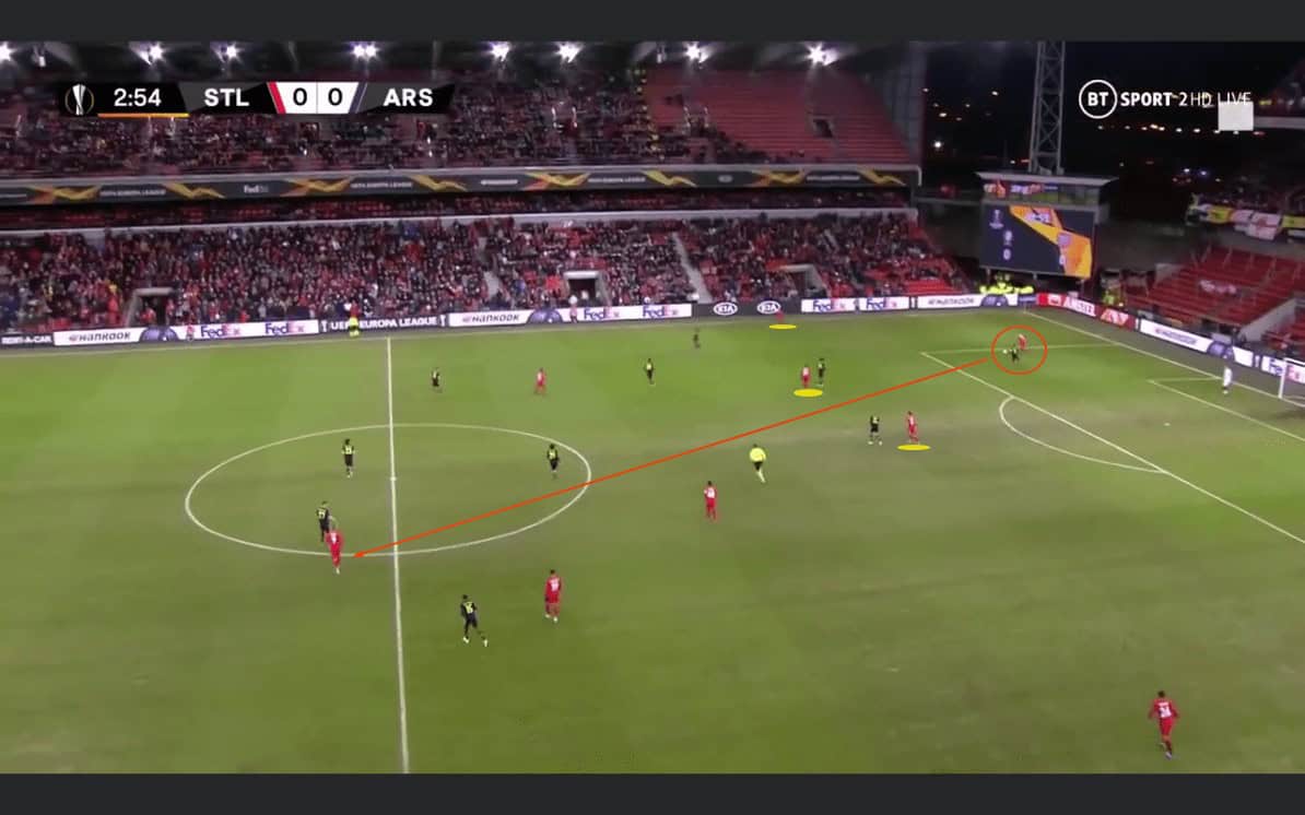 Vanheusden has pressure from the Arsenal attacker Alexandre Lacazette. He has minimal time to control and pick out his next passing option. Although there were ‘safer’ options for him to retain possession, this example highlights his confidence in passing the ball, as well as showcasing why he is a key player to lead Standard’s forwards.