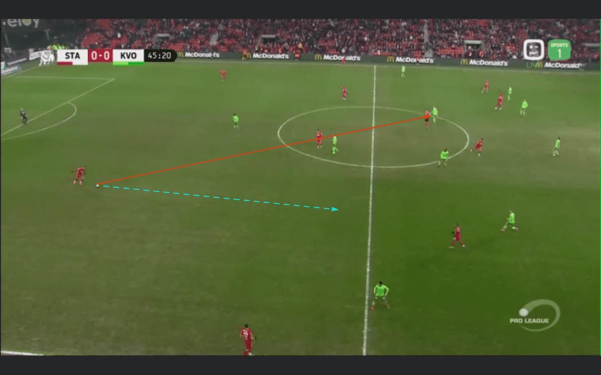 The reason why his passing stats aren’t higher is due to Standard’s lower possession-based approach to the game but also due to his positioning. The image below shows how Vanheusden takes up a deeper position to receive the ball. This gives him the opportunity to receive without pressure. But the disadvantage is that the distances and connections between his teammates become longer. Consequently, playing short forward passes is more difficult and Vanheusden has to play a predictable diagonal to the full-back or a long ball to the strikers.