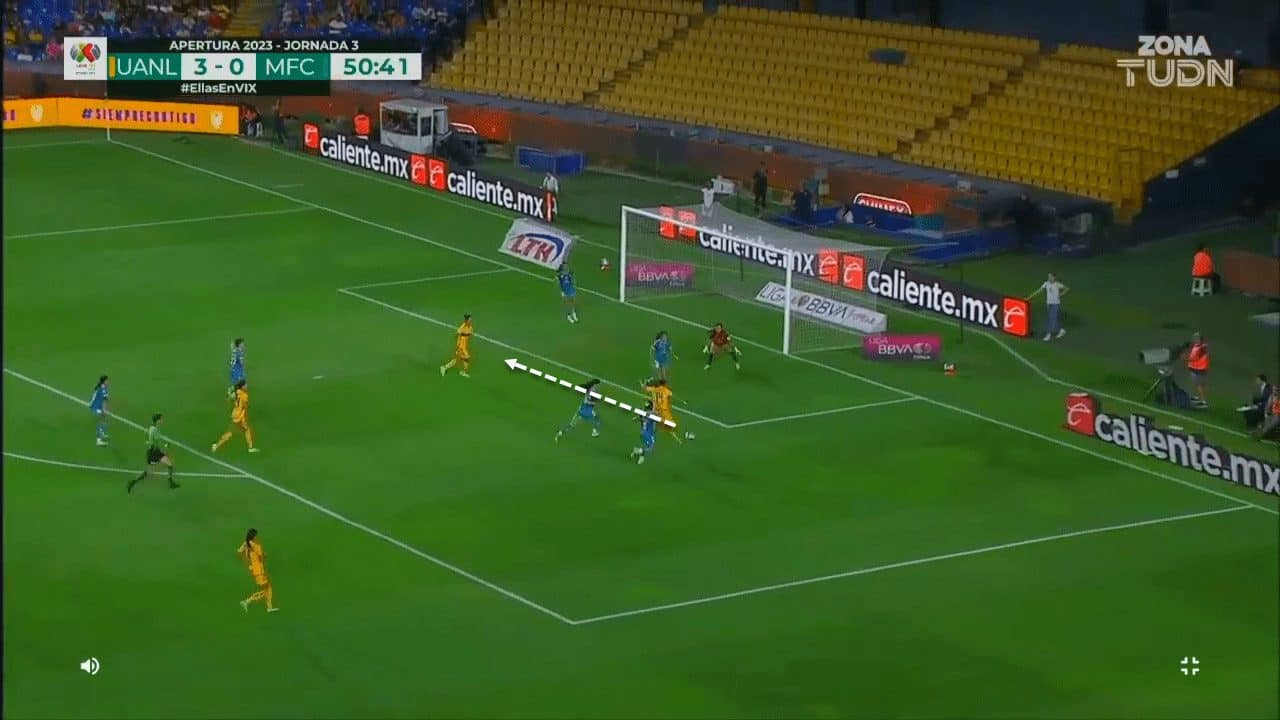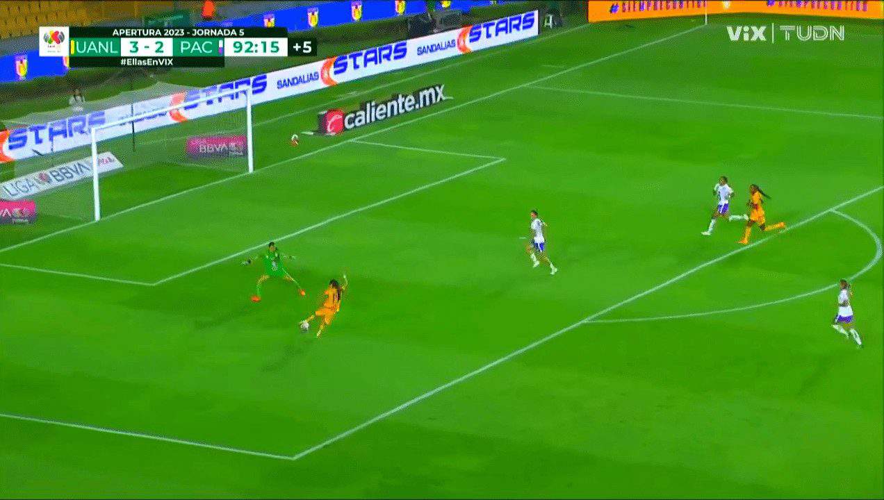 This opportunity demonstrates how easily Ovalle can dribble past the goalkeeper and find the fluidity to finish the action well afterwards, without giving the goalkeeper a chance to get close to the ball or showing signs of doubt or hesitation before executing her accurate feint.