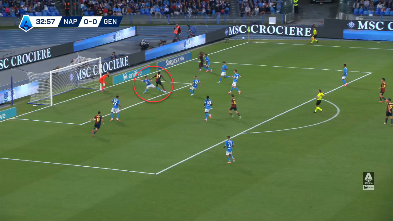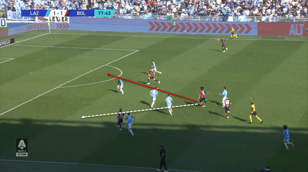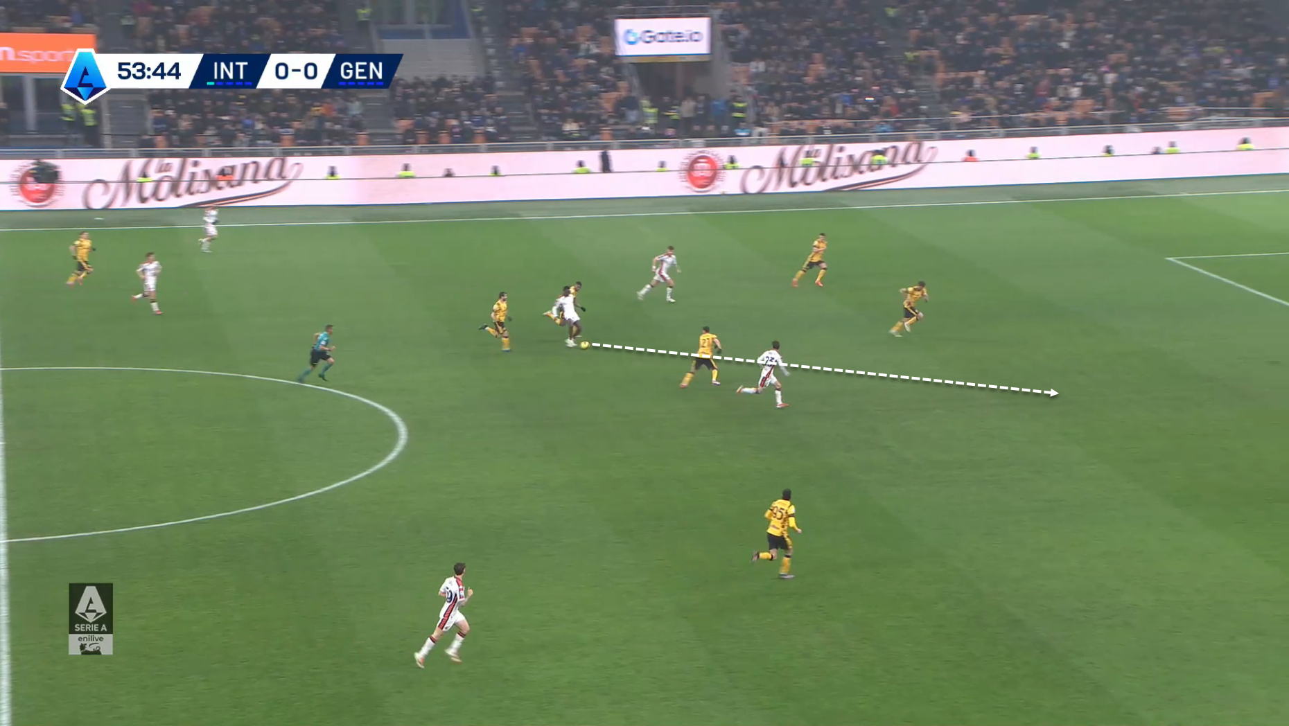 This can make Ekhator much more dangerous when coming from behind, as he can use the space he left inside the box through key passing to one of his teammates, as he did in this action against Inter Milan.