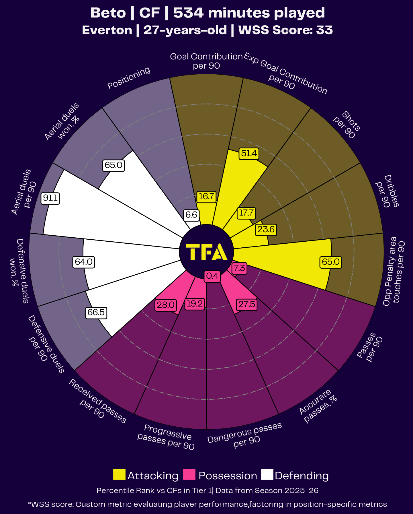 As the pizza chart of this season shows, Beto’s goal contribution averages were disappointing, especially if we compare them to the expected goal contribution rate, and the same applies to his number of shots and dribbles per game.