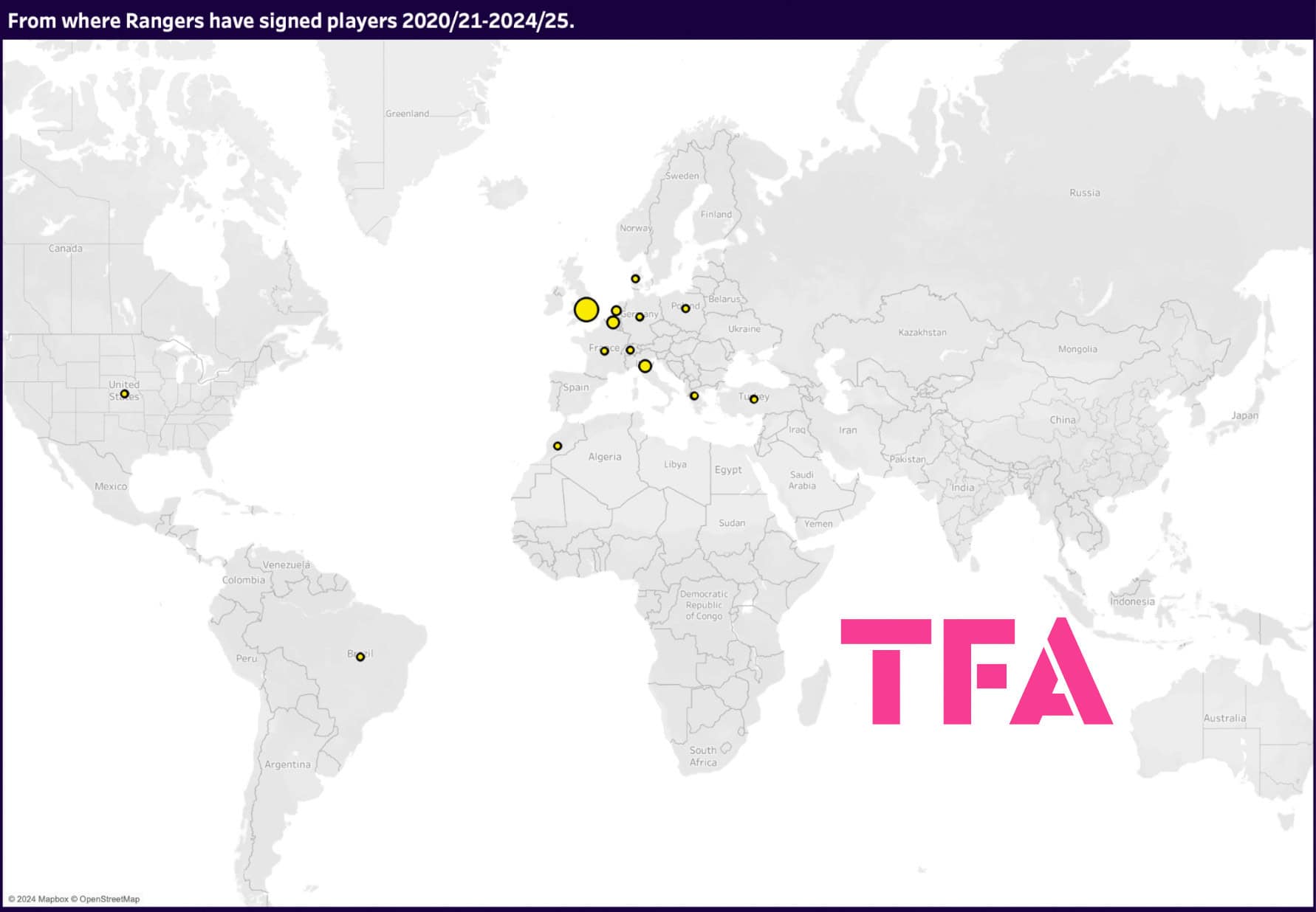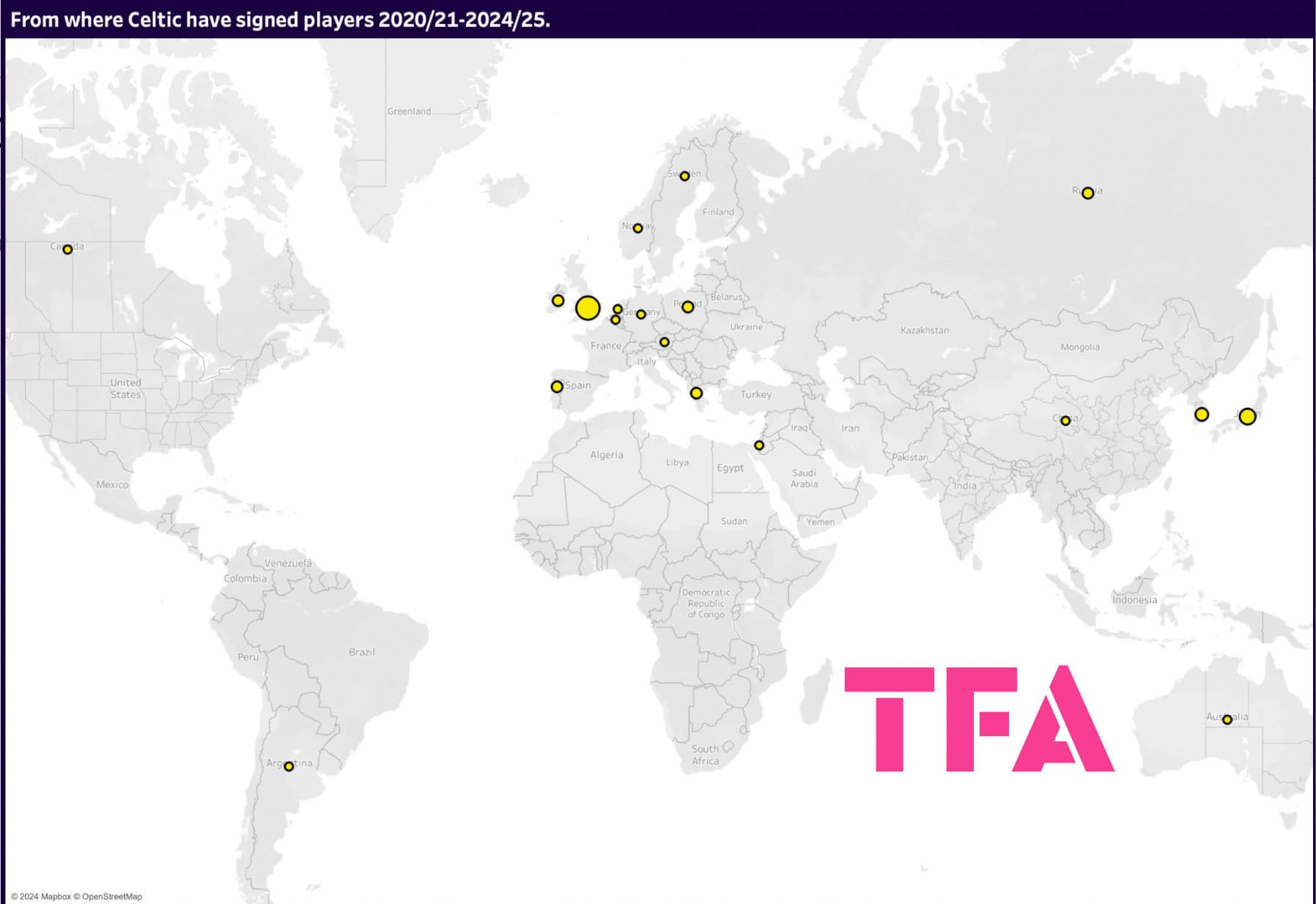 Nine of the 27 Celtic first-teamers have joined from other European nations — precisely a third of the team, which is Celtic’s most heavily used market, though no one European country in particular dominates the map, with a couple of signings from Ireland during the period analysed — unsurprising given Celtic’s historical connection with the neighbouring island — as well as two from Portugal, Greece and Poland in addition to one from each of the other European countries highlighted on our map of signings.