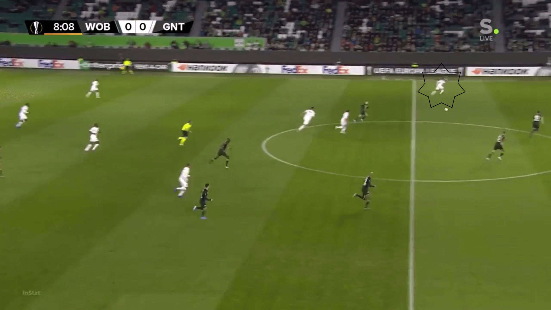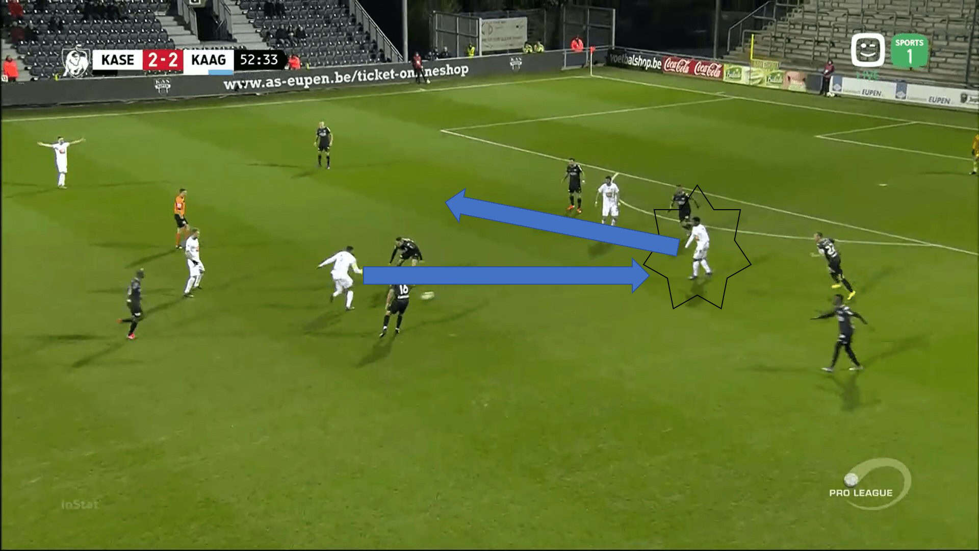 KAA Gent usually played in a 4-3-1-2, where there are no wingers. This means that David, being normally the attacking midfielder, had the freedom to drift onto whatever wing he wants. As he moved to the wings, he made himself quite difficult to mark and created an element of surprise for the opposition defence, as seen in the image below where he has moved to the left for a counter-attack.