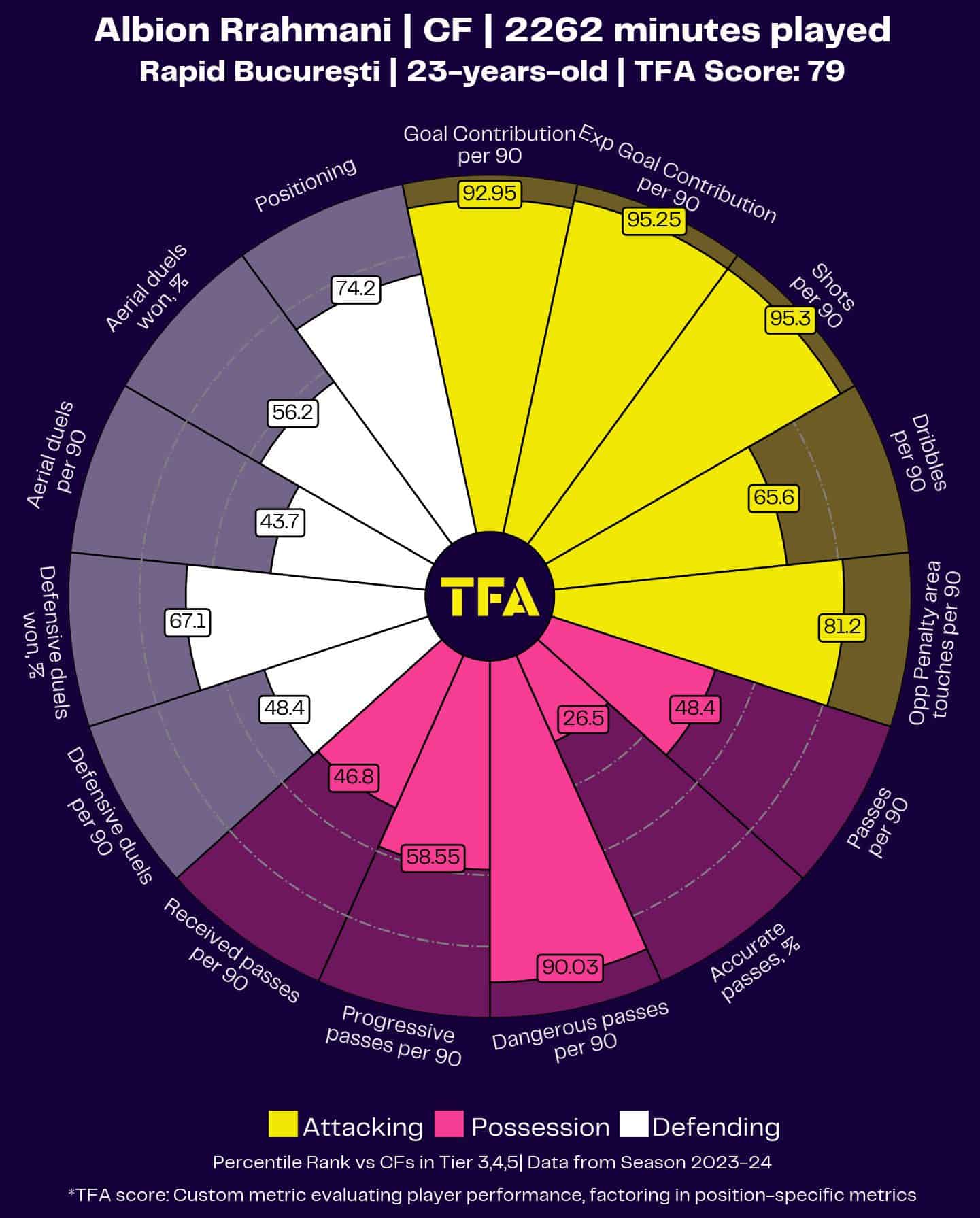 His ability to receive passes (46.8) and engage in dangerous passing (90.03) further complements his profile, suggesting he is not just a finisher but also someone who can play a vital role with his link-up play effectively in the final third.