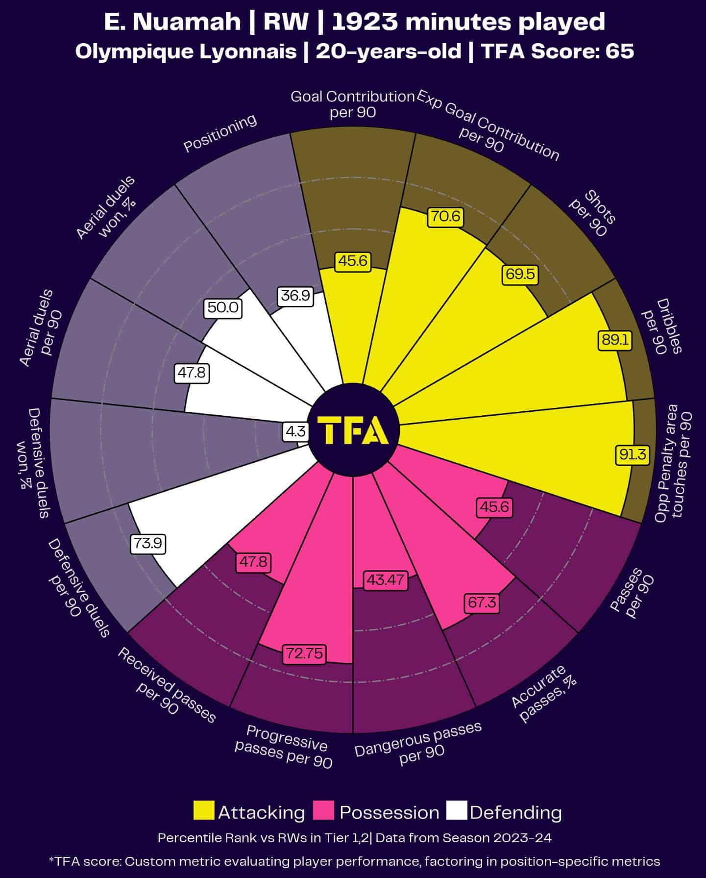 Nuamah’s radar chart paints the picture of a young, explosive winger who could add a new dimension to Manchester City’s attack, especially in matches where breaking down deep defensive lines is essential.