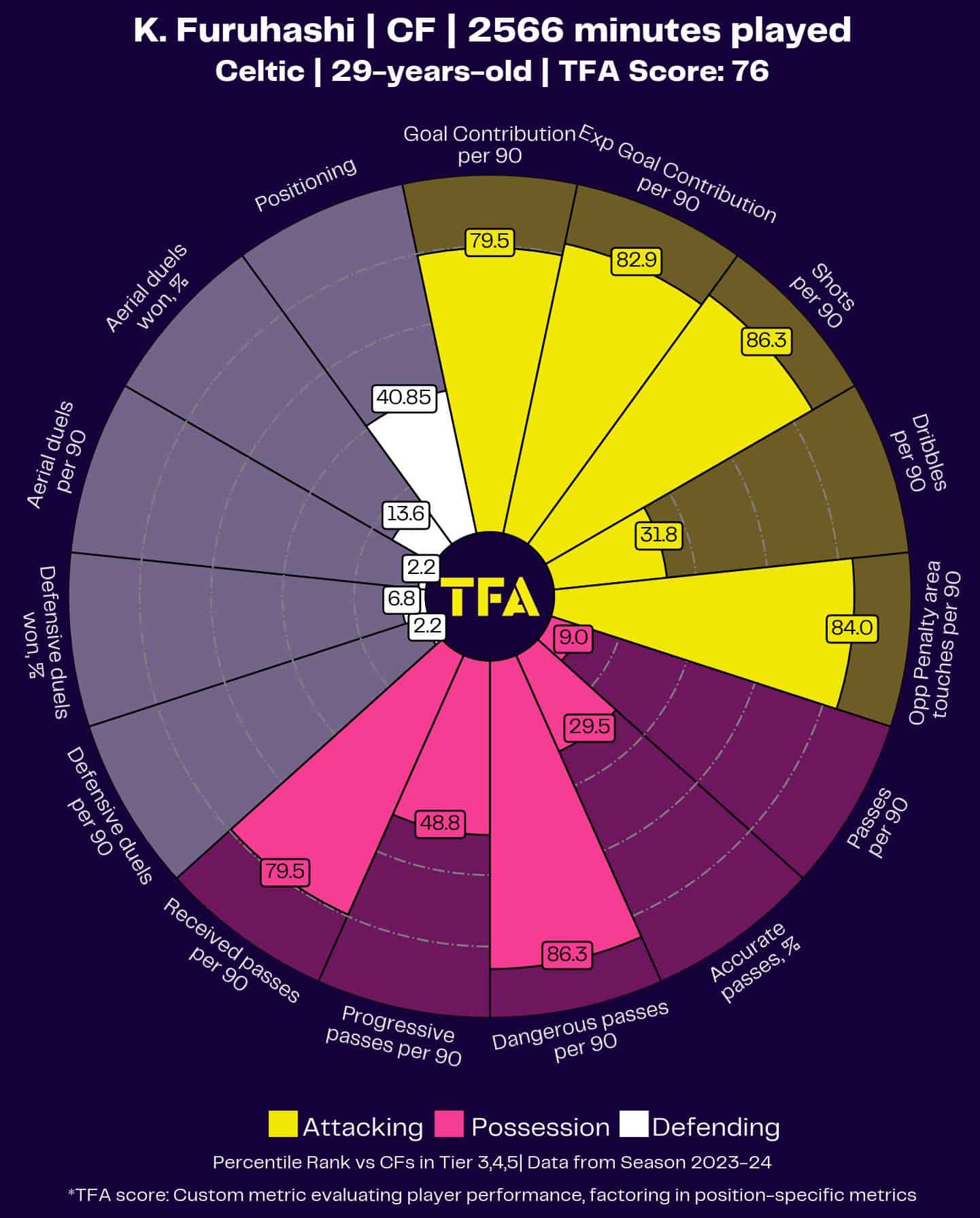 Furuhashi’s ability to move intelligently within the final third is highlighted by his 84.0 percentile in touches within the opponent’s penalty area, reflecting his knack for getting into goalscoring positions.