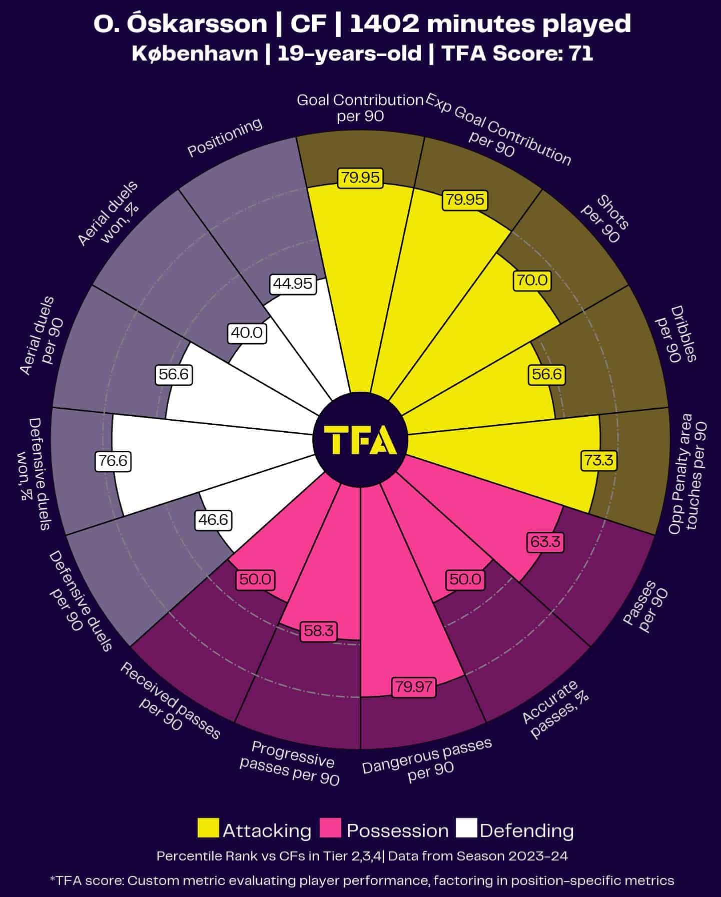Óskarsson’s positioning (44.95) and ability to receive passes (50.0) suggest he understands his role within the team’s attacking structure, making him a reliable option for linking play and maintaining possession in advanced areas.