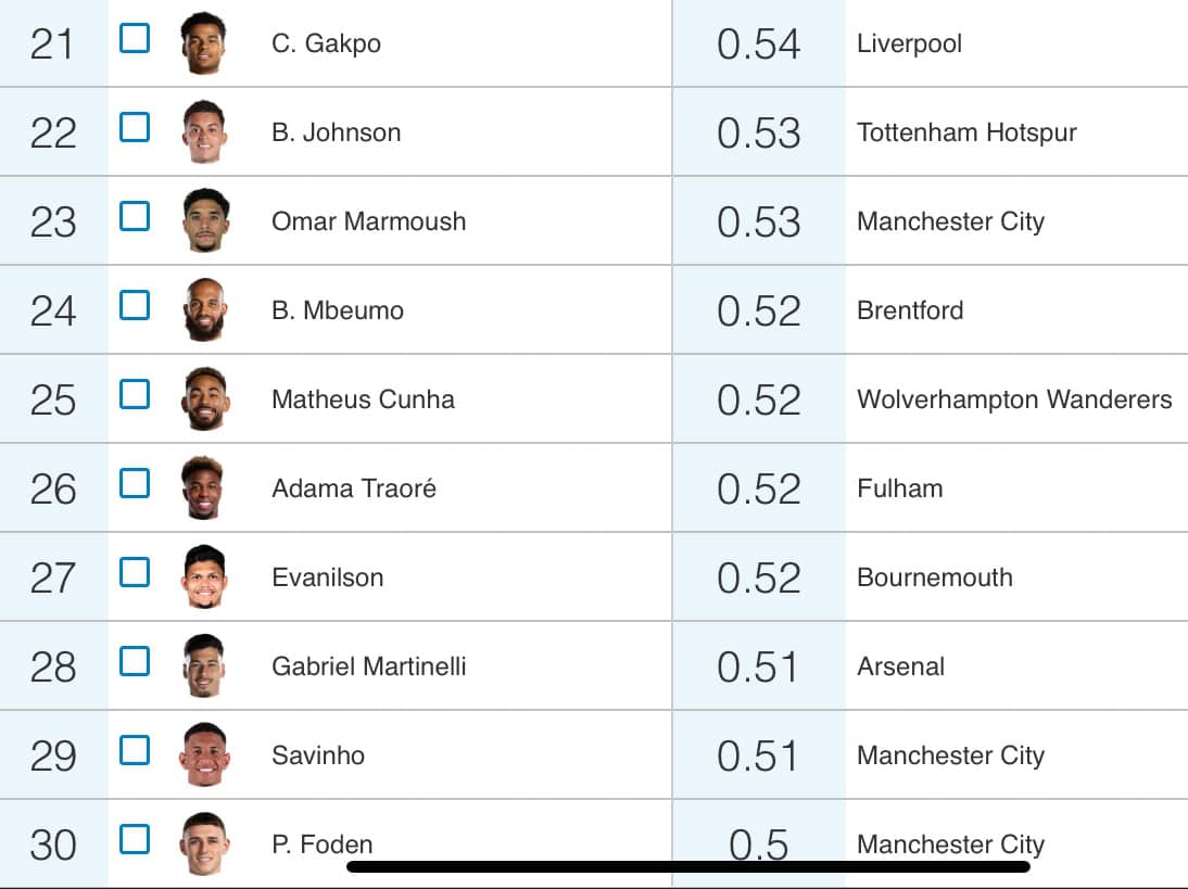 Cunha is in 25th place with an average of 0.52 xG+xA per 90 minutes; Mbeumo is one place ahead of him with a very similar number.