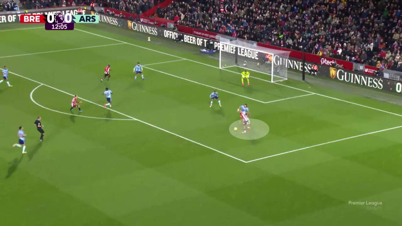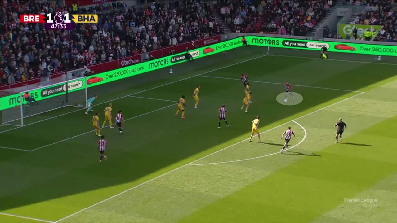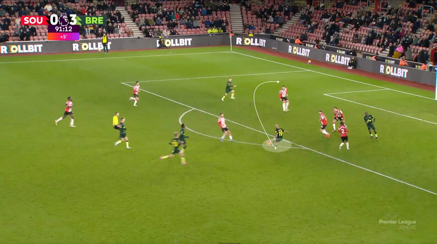 However, the highlight of Mbeumo’s creation is his ability to open up his body, particularly for a cut-inside move rather than shooting, but to send crosses or cut-backs to his teammates.