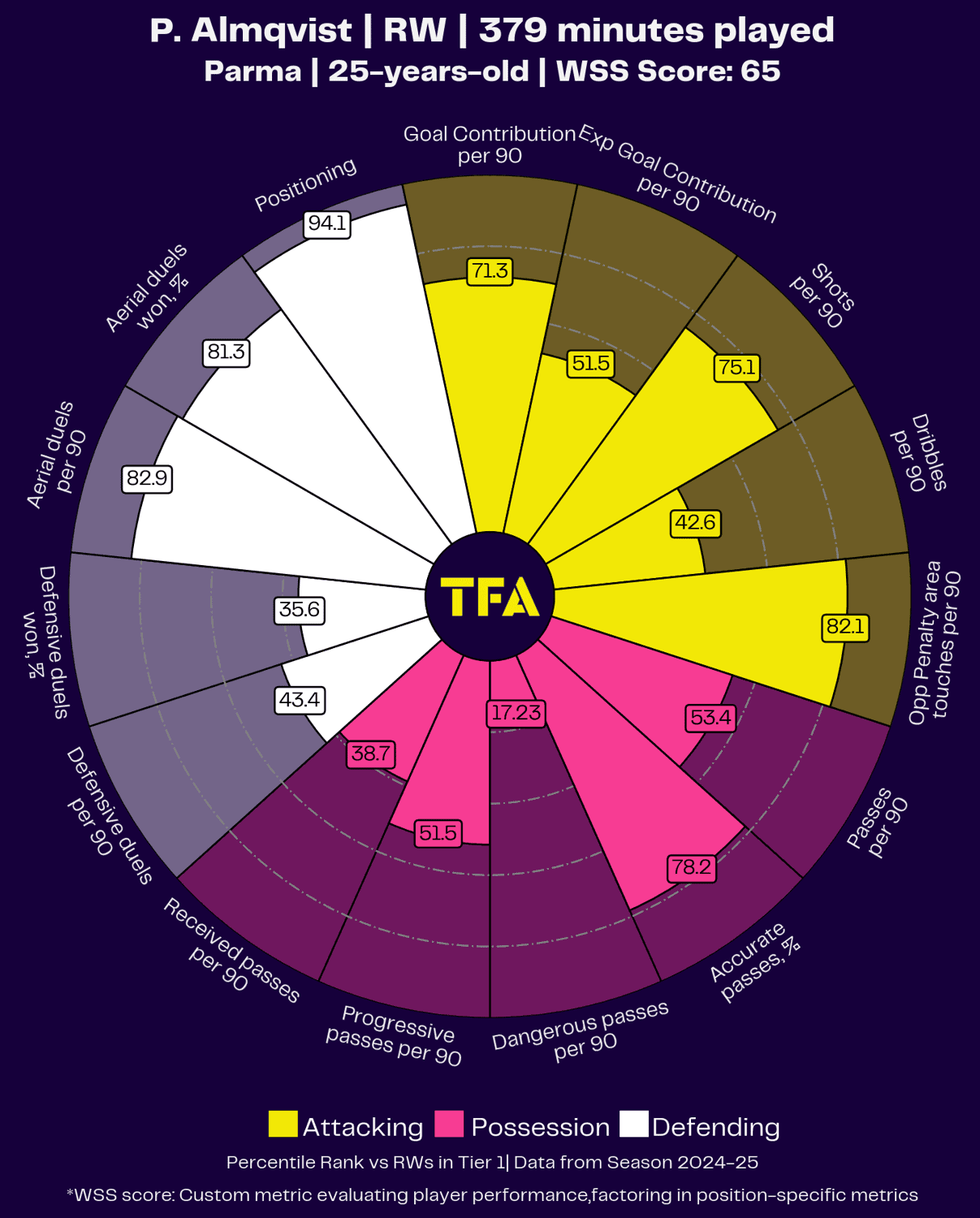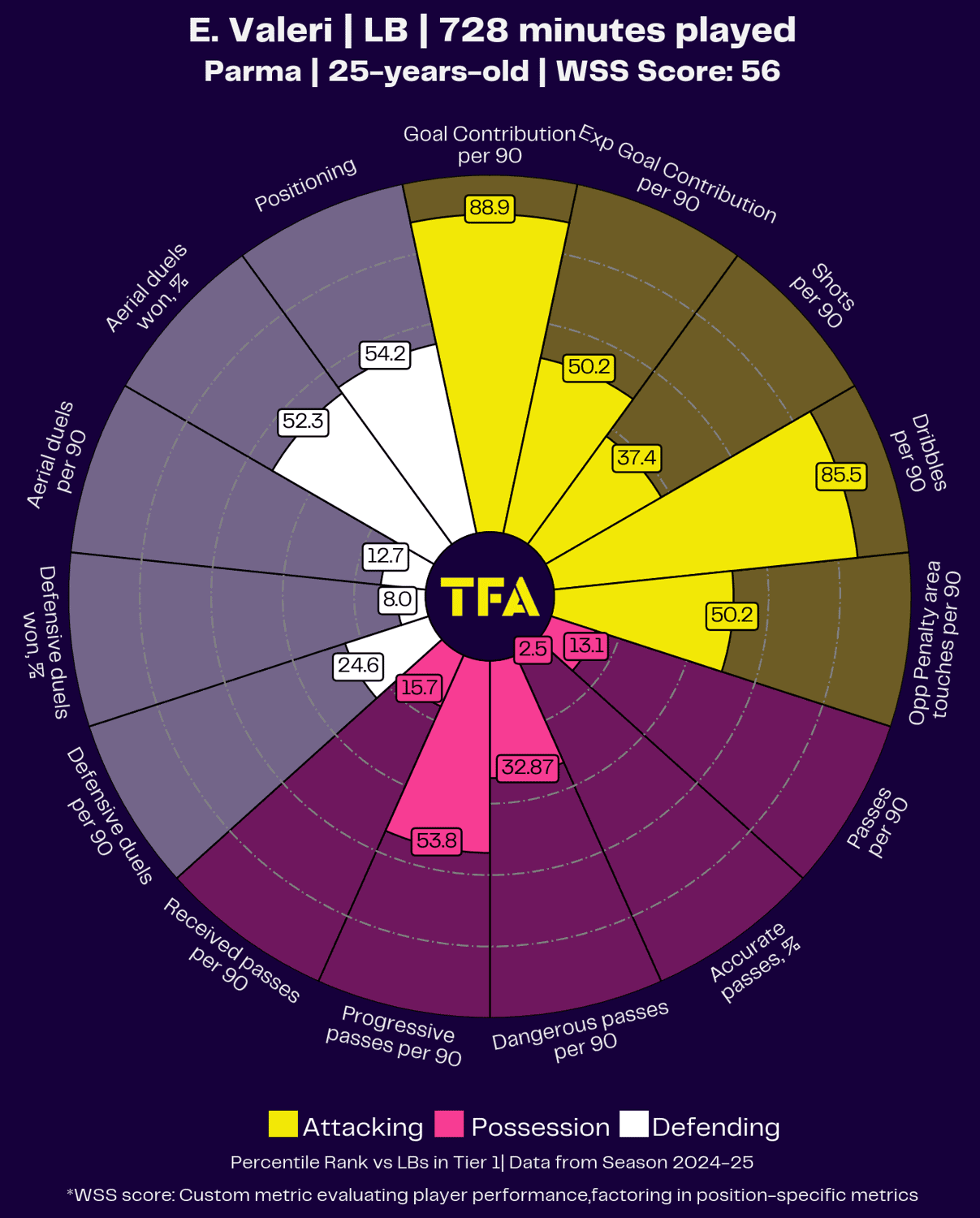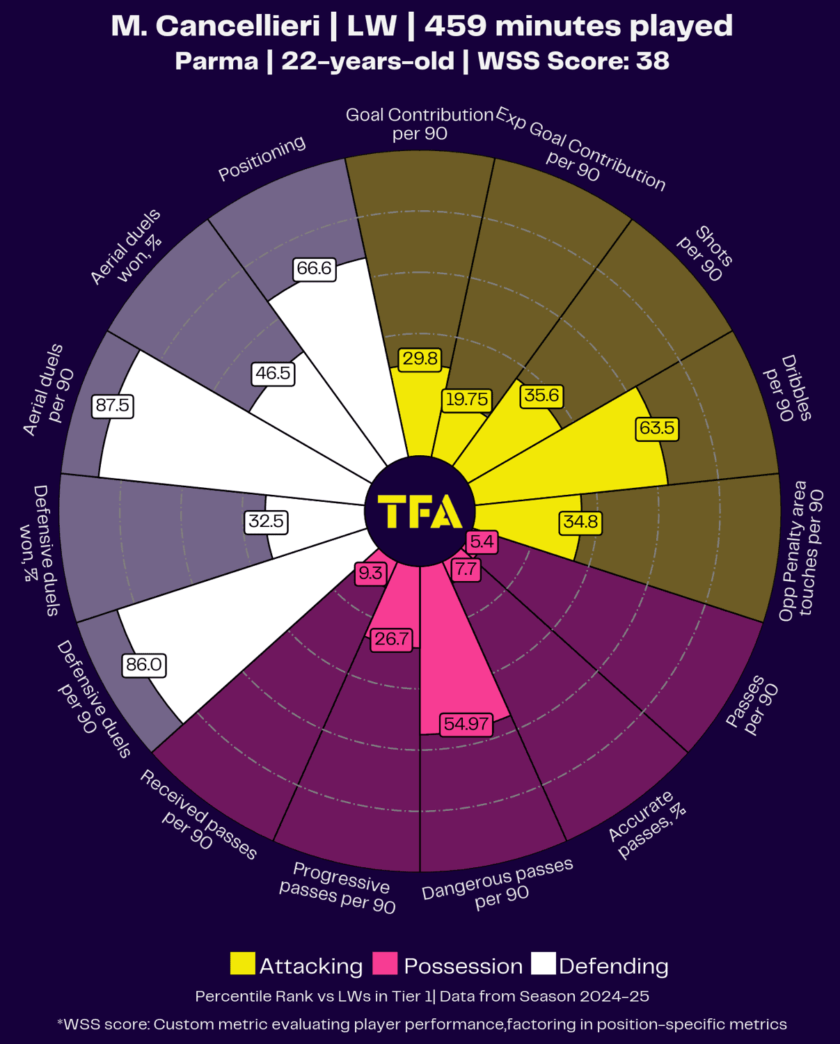 It appears that Parma tasks their wingers with more defensive duty than the average winger in terms of defensive duels, a box that Cancellieri is ticking.
