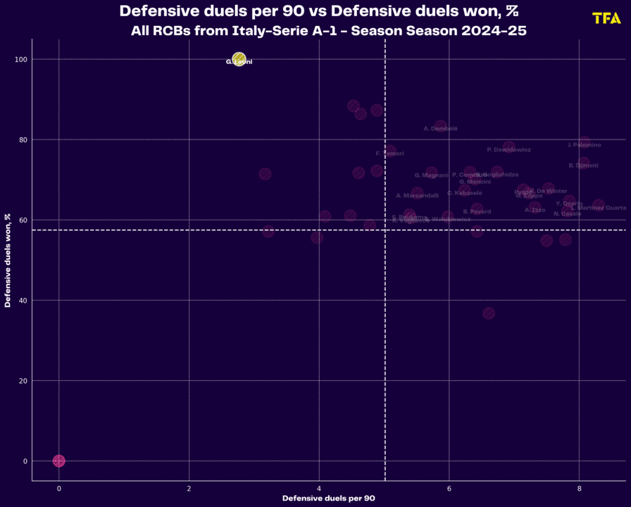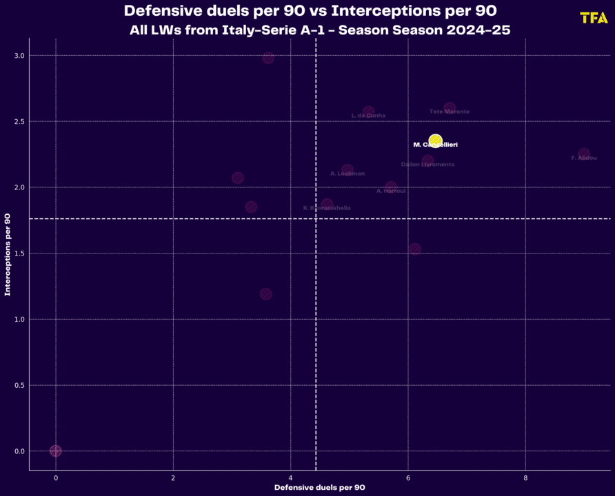 5.99 defensive duels per 90, with a success rate of 59.6%, is far above the average left-winger in Serie A.