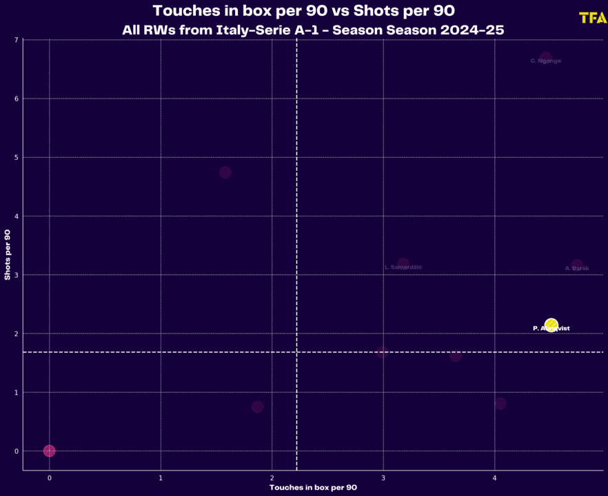 As you can see above, compared to Serie A right-wingers, Almqvist ranks third for touches in the box per 90 minutes and fifth for shots per 90 minutes—indications that he is doing the right things in certain areas; he needs to continue to do that.