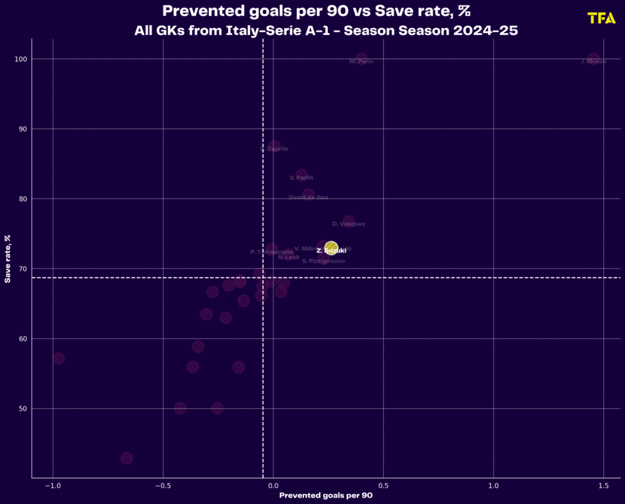 As you can see from the graph above, Suzuki ranks comfortably average compared to Serie A GKs in save rate % and prevented goals per 90—an indication that he is able to provide consistent quality between the sticks for Parma.