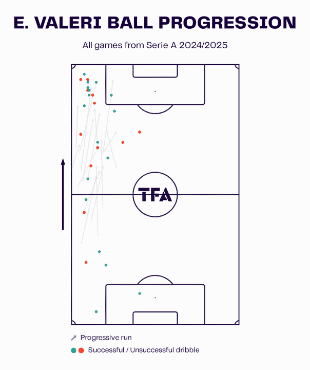Interestingly, most of Valeri’s ball carries occur higher up the pitch – perhaps an insight into Parma’s tactics as far as the full-backs are concerned.