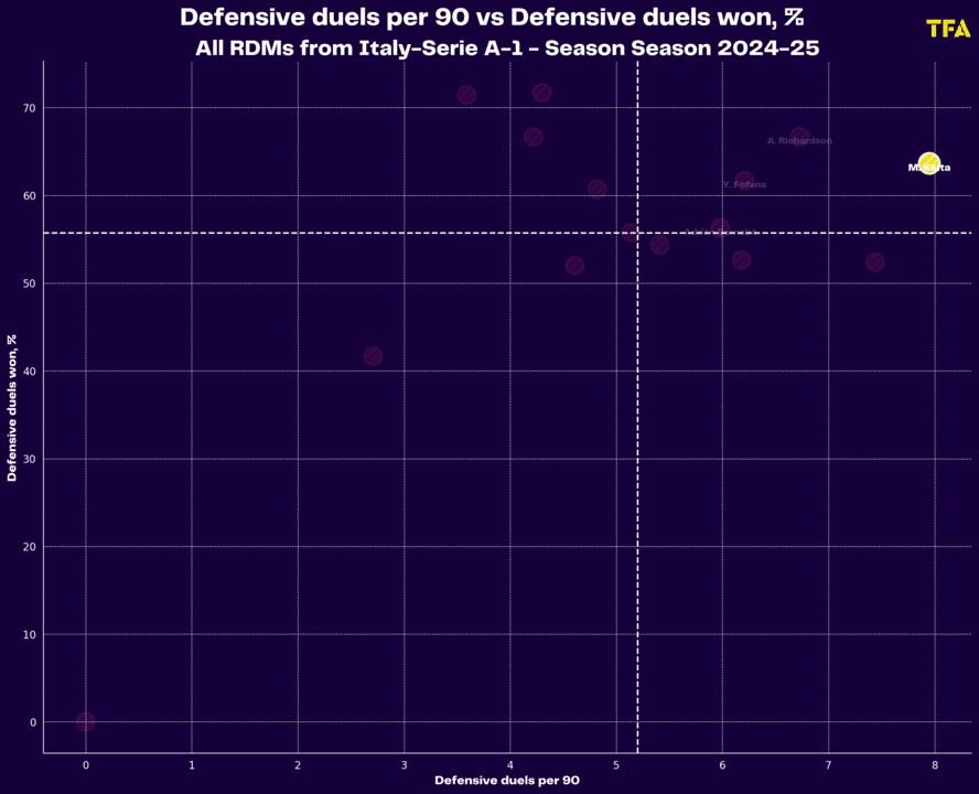 His rate of 8.45 defensive duels per 90 is higher than any Serie A right defensive midfielder, and he is the fourth-highest among Serie A defensive midfielders, so you can expect him to constantly apply himself defensively in midfield.