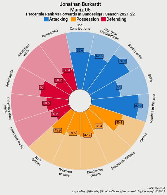 The last two players that we will take a look at are both currently based in Germany with the Mainz 05 striker Jonathan Burkardt currently being responsible for 14.88% of his sides goals and 14.08% of their xG.