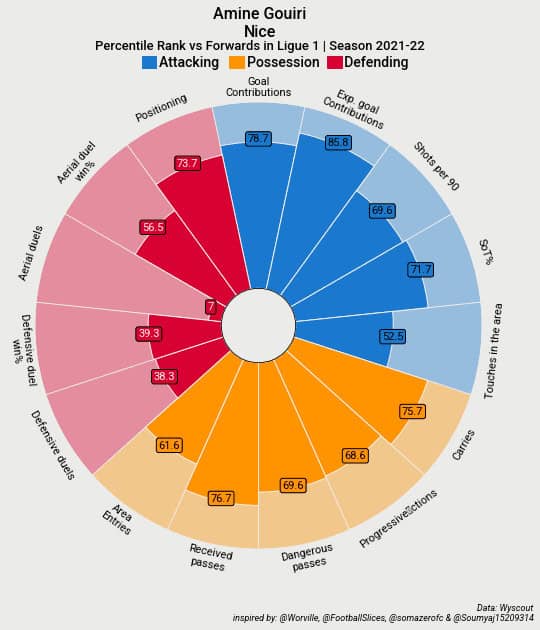 As you can see Gouiri is performing well in the attacking (blue) section with excellent outputs for expected goal contributions, showing us that he gets into good areas, and for goal contributions. His outputs in terms of shots per 90 and the % of those shots that are on target are also impressive. Gouiri is also a forward who drops into deeper areas and comes into the channels. As such his ball progression section (orange) is also strong with good outputs for carries, received passes and dangerous passes. He also gets the ball into the area at a good rate as we can see from his area entries.