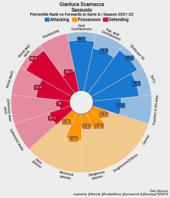 Next up we will look at the Italian international Gianluca Scamacca of Sassuolo in Serie A. If you look at Scamacca’s pizza chart and quickly compare it to Gouiri above then you will immediately see that Scamacca is more of a traditional forward type as opposed to a more mobile and creative forward like Gouiri.