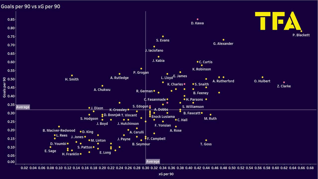Kawa is the evident outlier with 0.85 goals per 90 smashing his xG per 90 stat of 0.42.