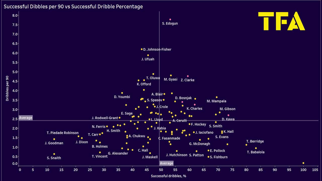 When you compare all the players’ successful attacking actions per 90, Edogun is clearly ahead.