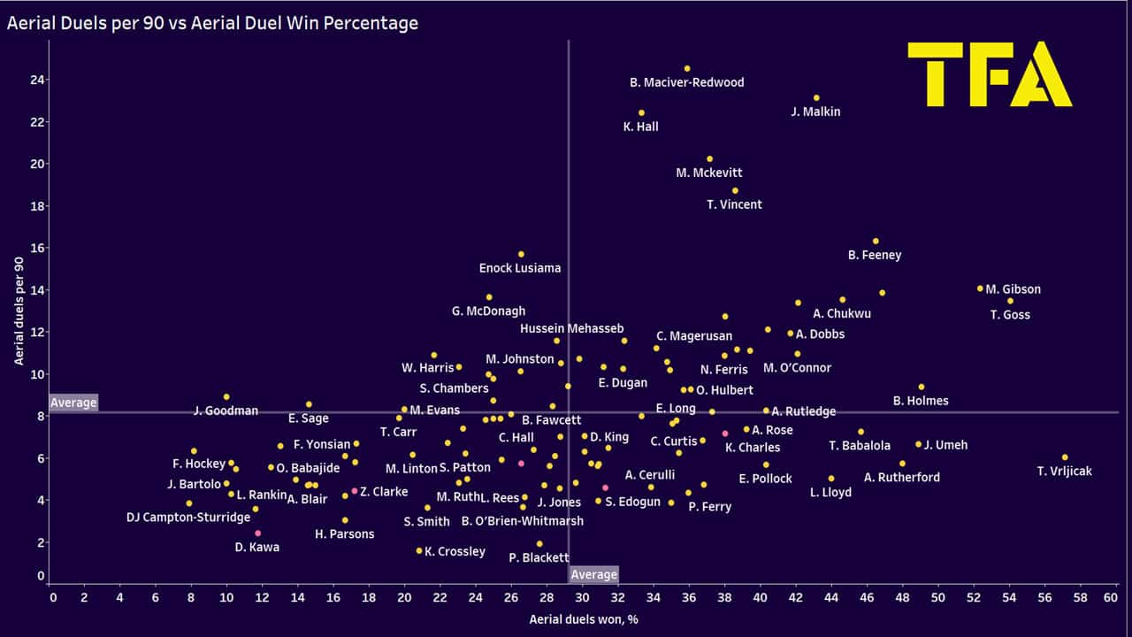 Both Charles and Edogun have scored above average in their success rate when competing for the ball in the air.