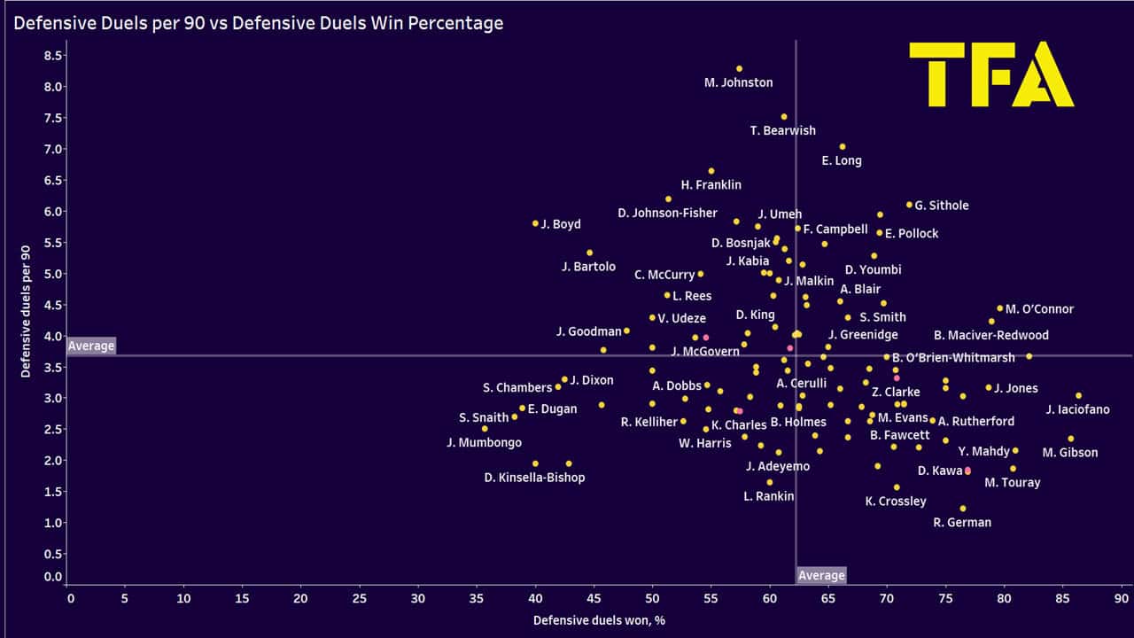 McGovern, like Edogun, scores above average for number of defensive duels per 90.