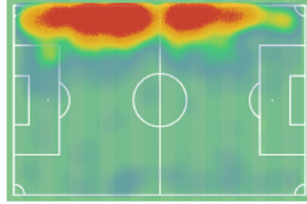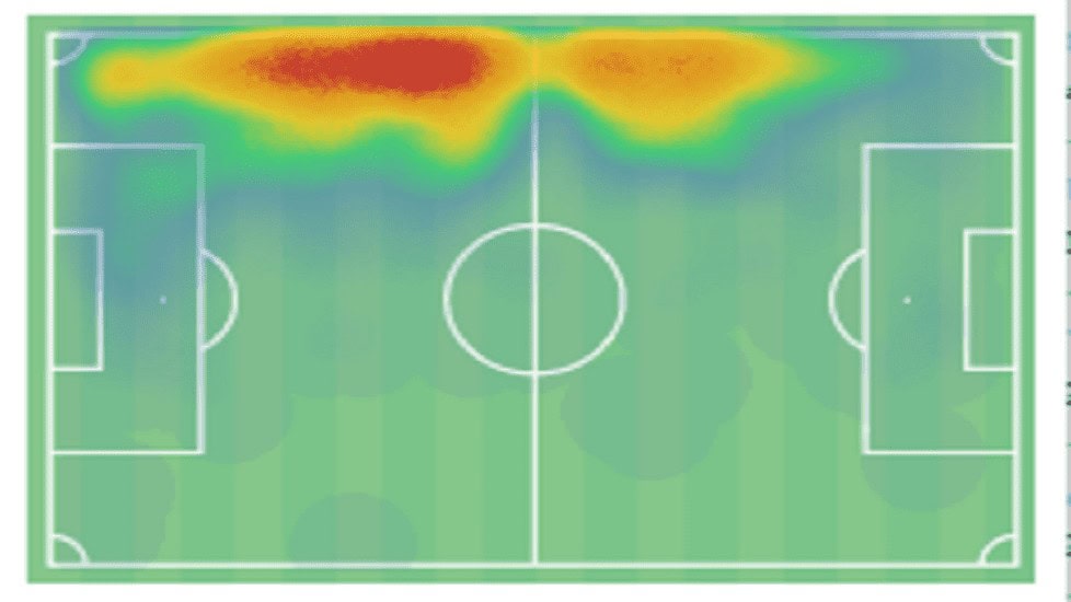 Furthermore, in addition to that, this image shows us that De Smet didn’t get quite as far forward on the pitch for Sint-Truidense last season as Kamara did for Reims, as the new Reims man didn’t really progress past the middle third of the pitch very frequently at all, as visualised by this heatmap.