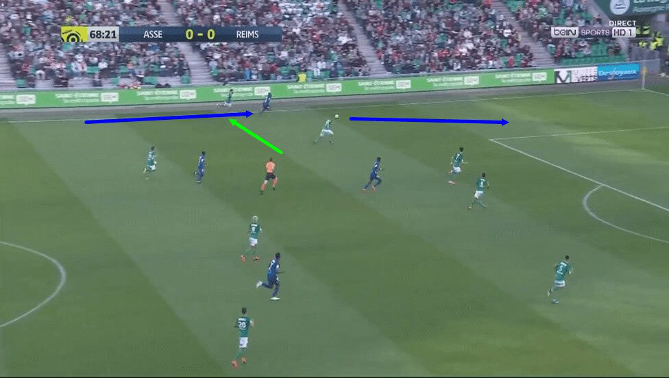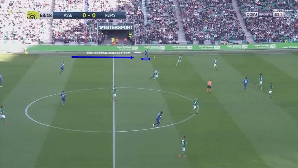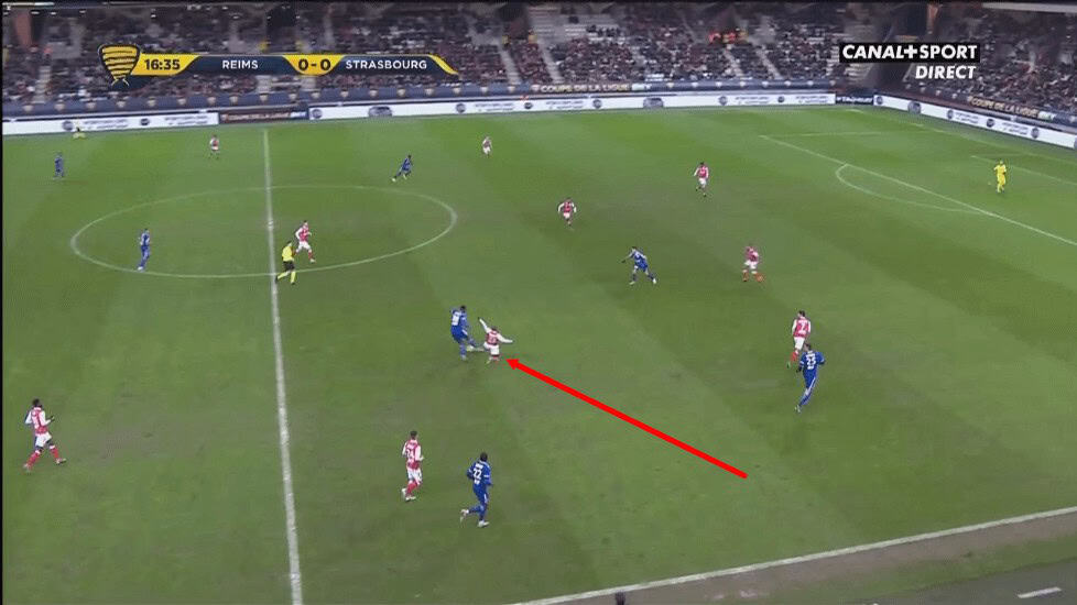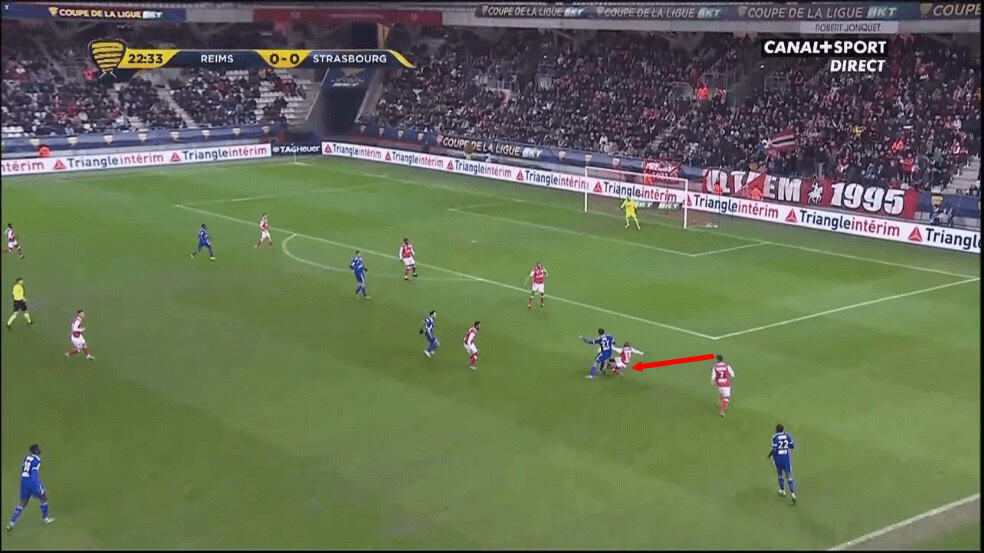We previously discussed the importance of Kamara’s role in the build-up for Reims last season. His ball-progressing ability and pace were integral for Reims during the build-up at times.