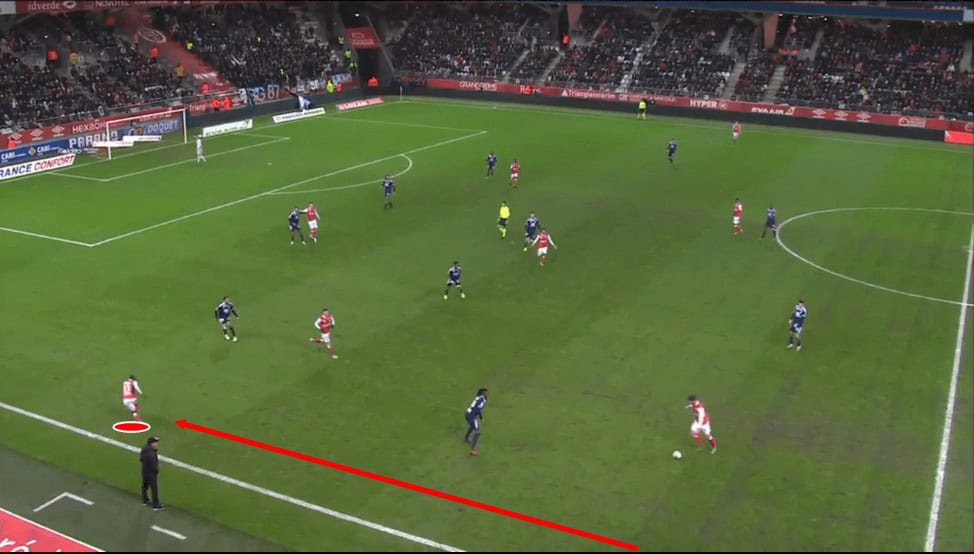 We can see an example of Kamara occupying this position during a particularly advanced phase of Reims’ build-up in the image above. The left-back combines with Reims’ left-winger to create a 2v1 situation versus the opposition right-back on this occasion and the deep ball-carrier can pick out the left-back’s run via a long-ball as a result.