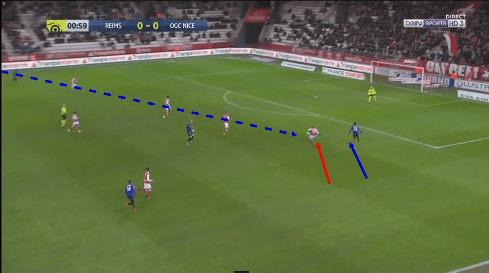 He provided cover for Reims from the left-back position when the opposition attempted to play long-balls in behind the defensive line, as we can see in the image above.