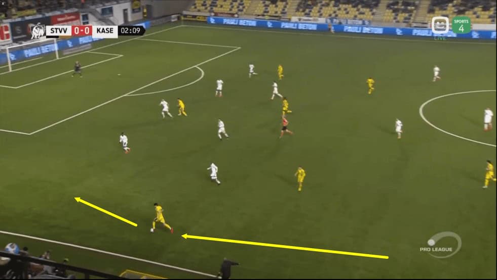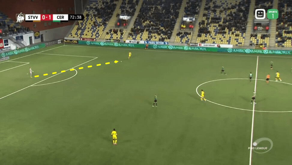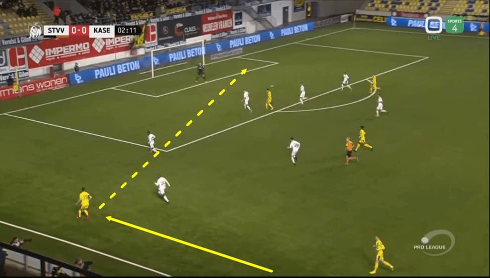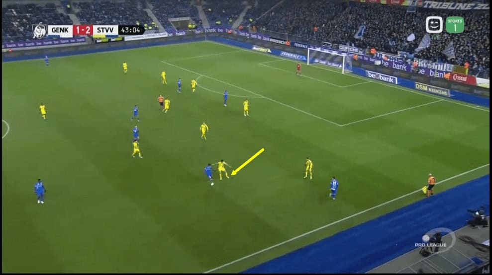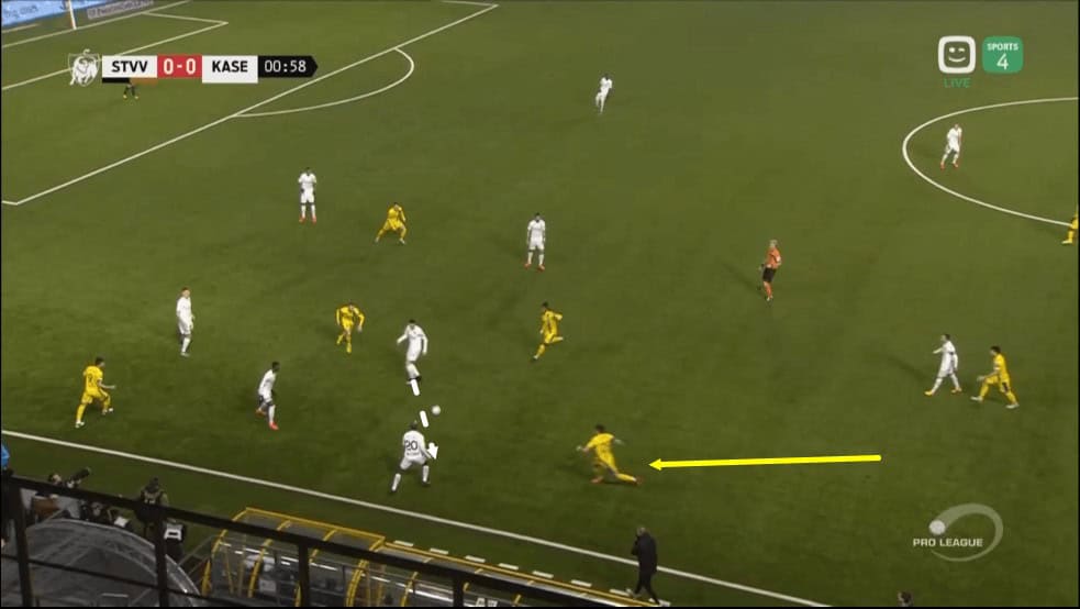 As play moves on, De Smet does attract an opposition player’s press, however, he acts fairly calm under pressure and isn’t put off attempting the pass that he had intended, which is a long-ball over the midfield in search of his teammate who we can see occupying Sint-Truidense’s left half-space here.