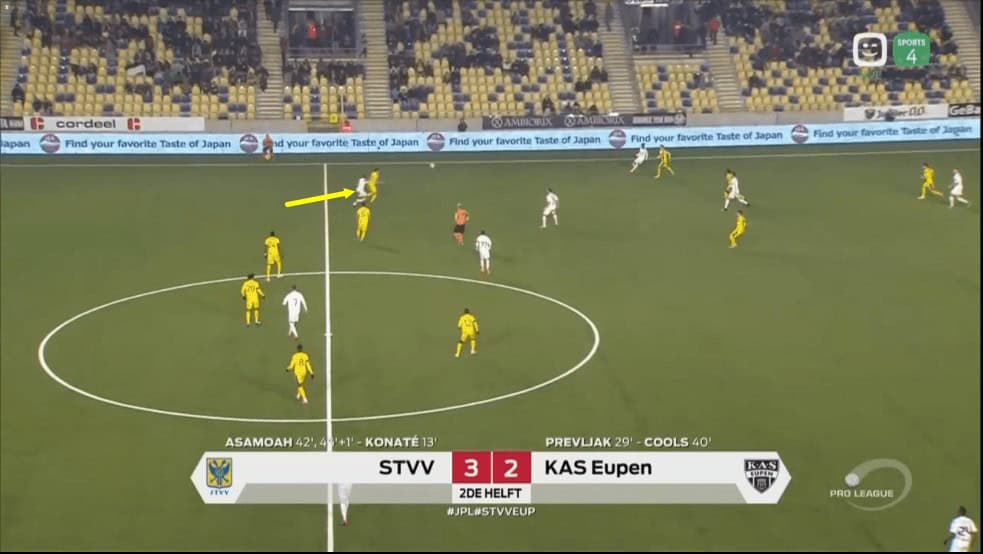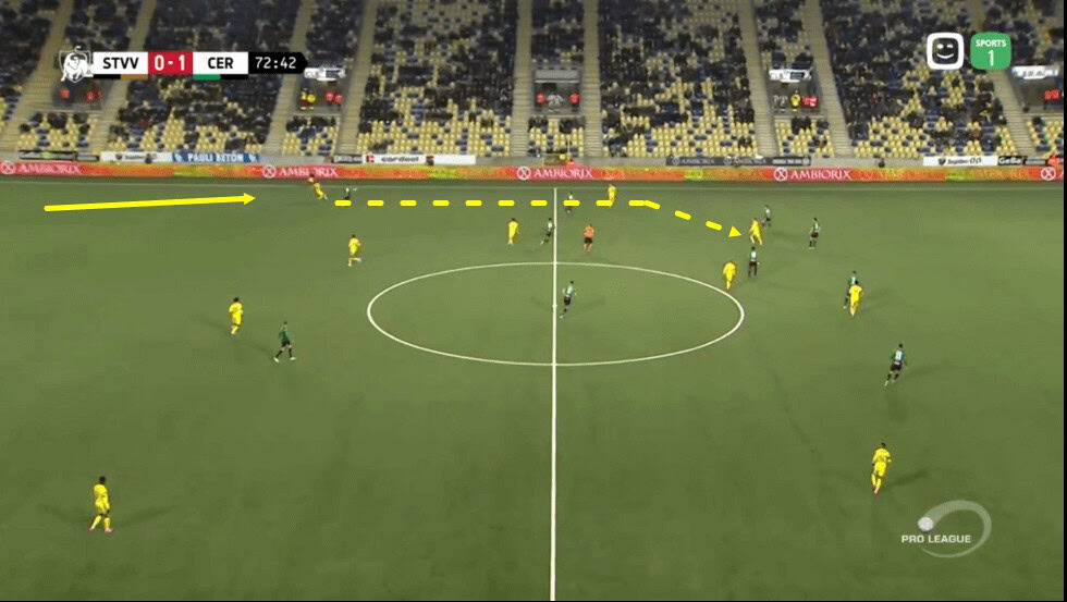 Here, we can see De Smet carrying the ball down the wing from the middle third of the pitch whilst playing against a deep and narrow defensive block. During this particular passage of play, Sint-Truidense were prevented from playing through the centre of the pitch by the opposition’s compact, narrow defensive shape and they were forced to play through the wings, which De Smet facilitated.
