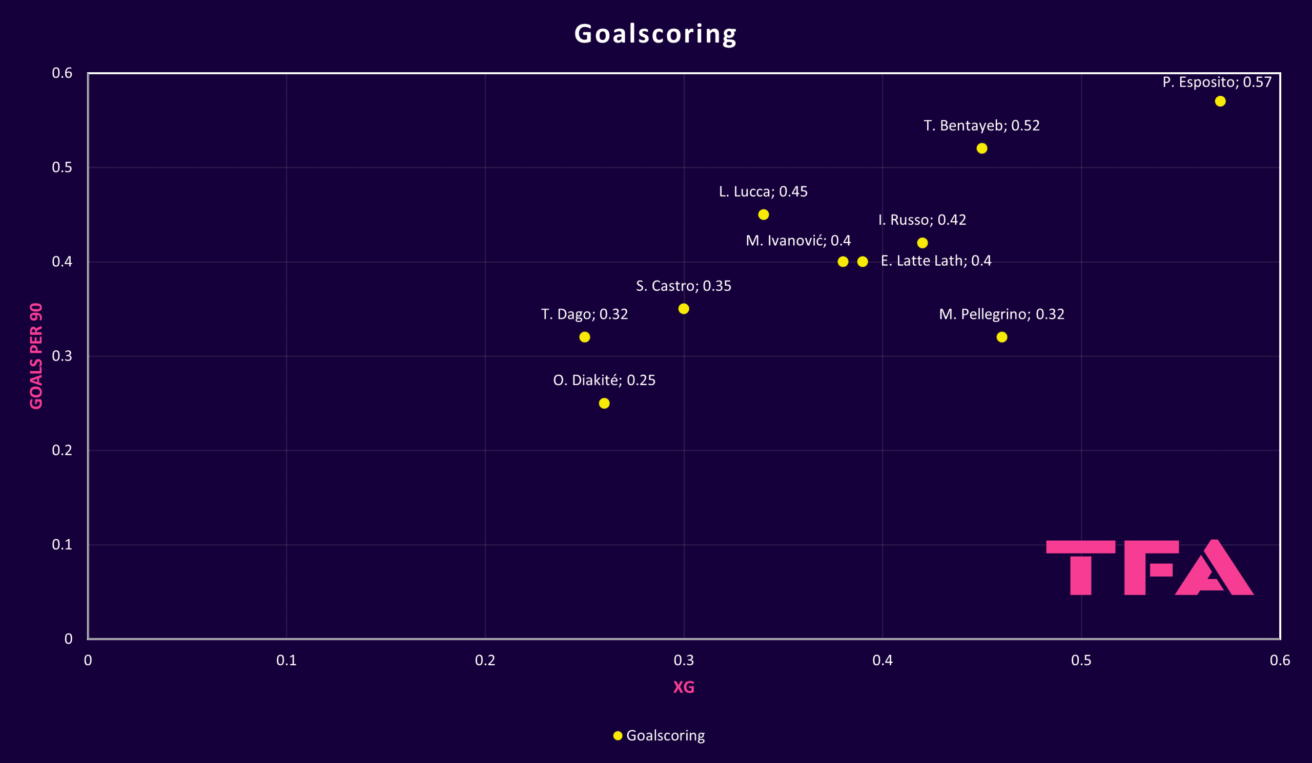The following graphic shows that Esposito has the highest xG and also the highest rate in terms of goals per match, as he scored 19 goals in 39 Serie B games last season.