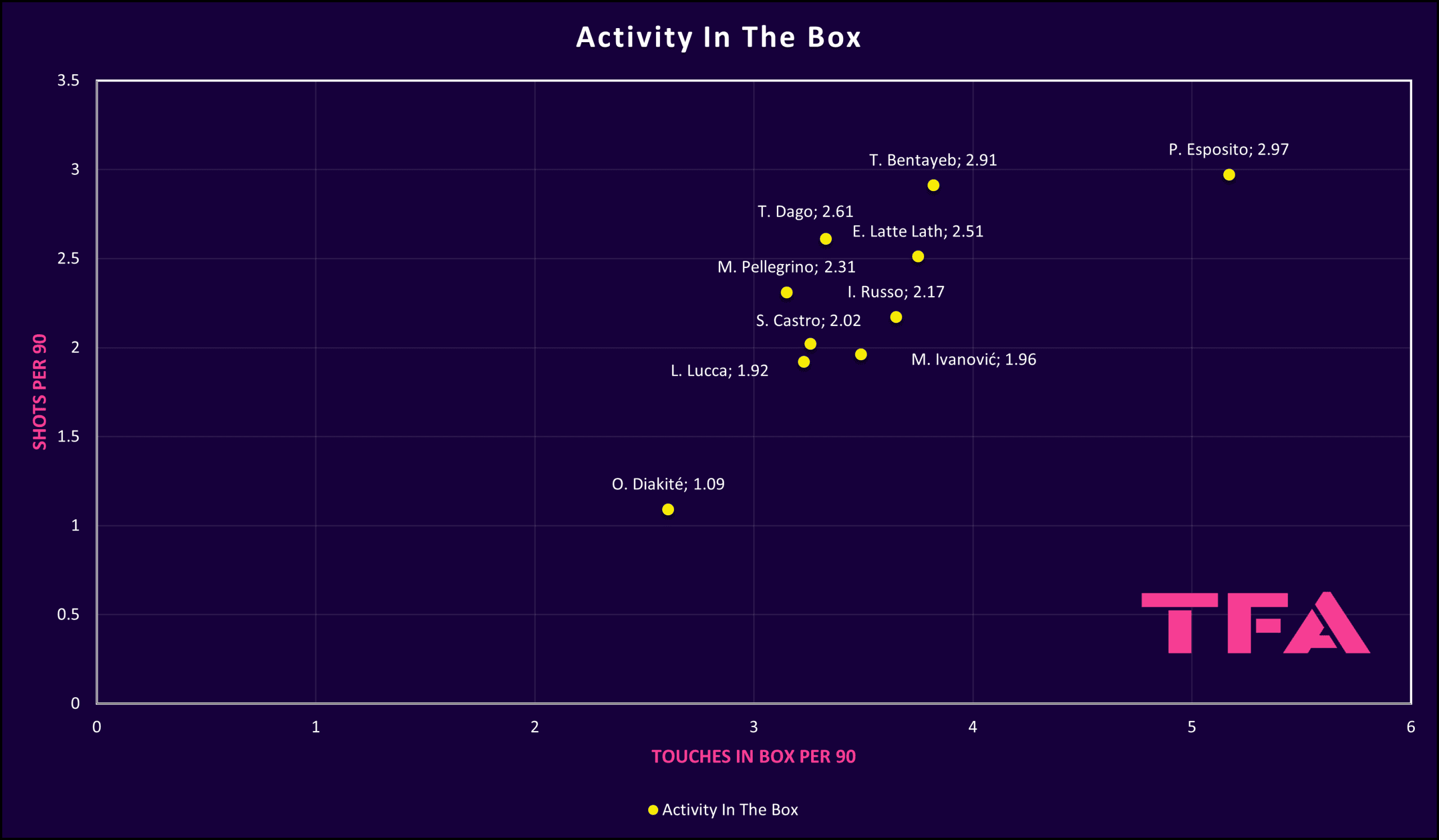 The graphic once again highlights Esposito’s high number of shots per match and higher number of touches inside the box per match compared to the rest of the players.