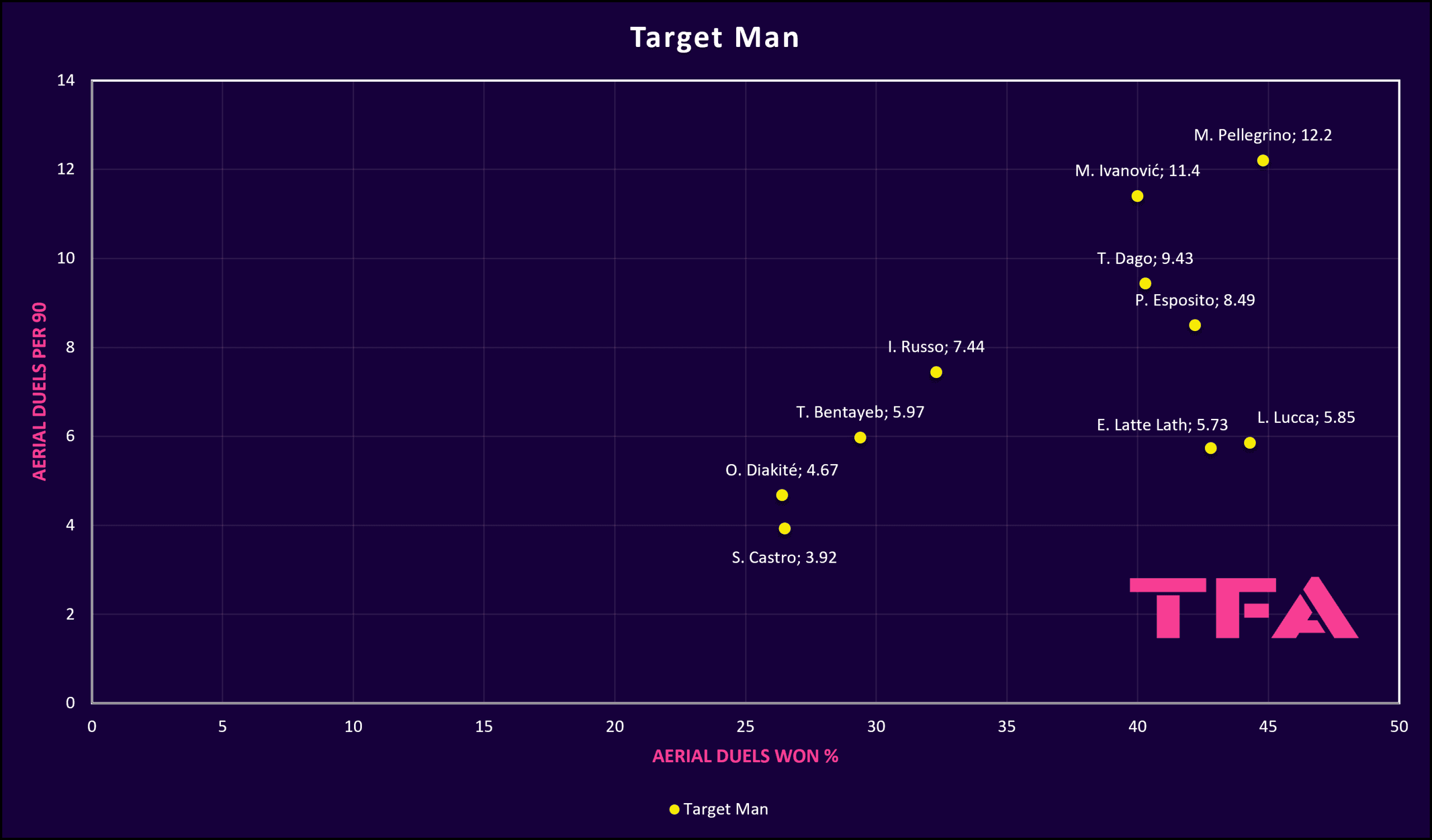That said, Pellegrino can be considered the best in this regard, despite playing in Serie A and against powerful defenders in the air, which makes him the best fit for the target man role.