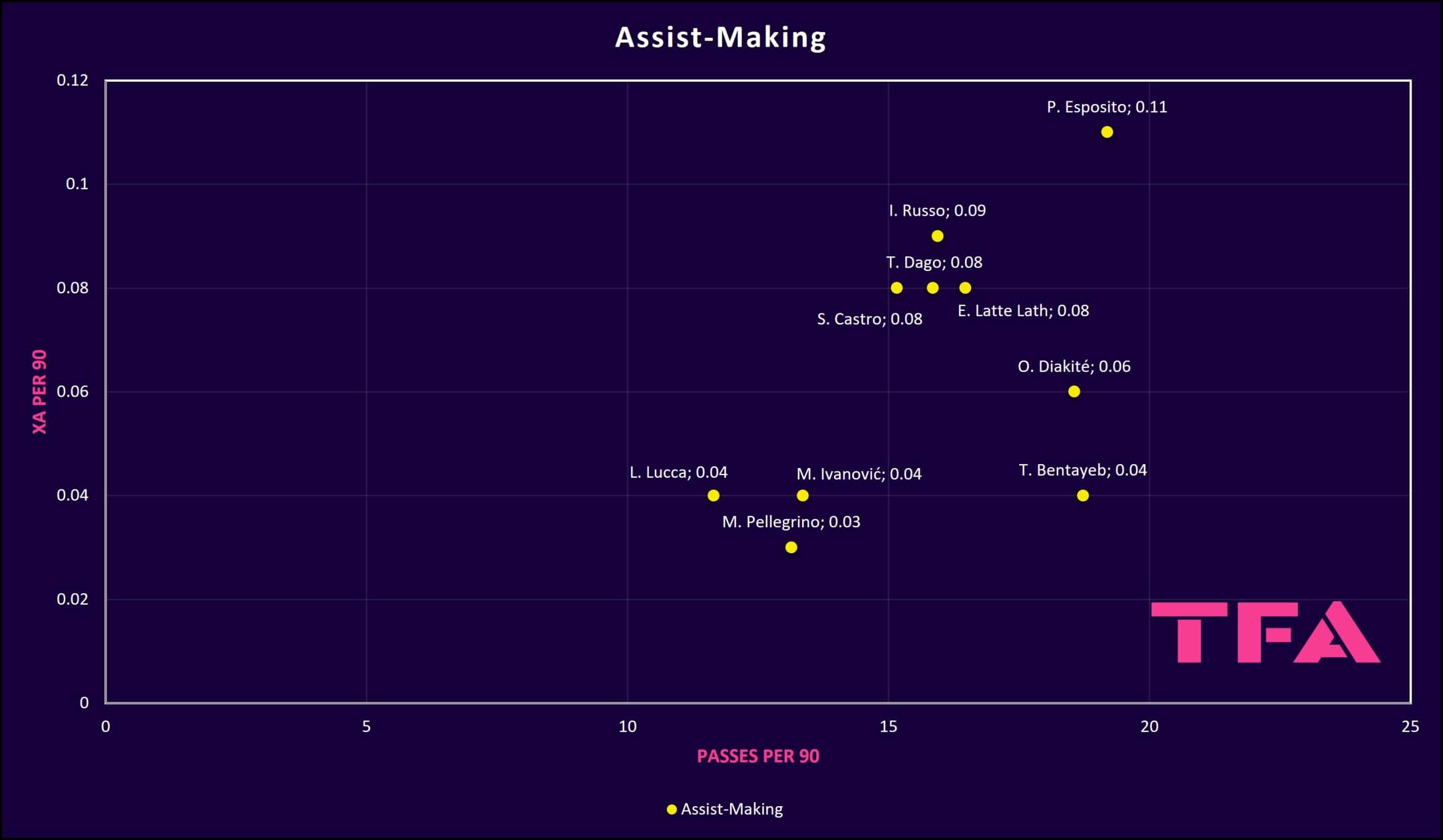 Although Lucca is not the best example in this regard, as he has low rates, many of the selected strikers can be very useful in terms of assist-making, with Bentayeb, Esposito, Diakité and Latte Lath holding the best positions in this regard.