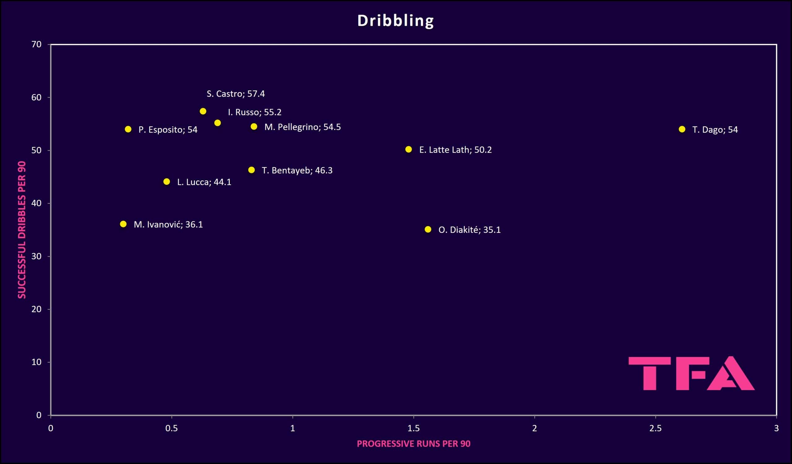 That said, Bentayeb, Esposito, Pellegrino, Latte Lath, Dago, Russo, and Castro all have higher successful dribbling rates than Lucca, which means that all of them are good enough from this perspective.