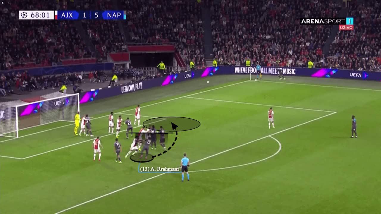 An alternate method of creating chances in deeper areas is through the use of screens. As we mentioned before, Napoli have shown the knowledge and adaptability to adjust to different defending styles. Against Ajax in the UEFA Champions League group stage, we can see Ajax setting up in a man-marking style, pairing everyone up 1v1. Napoli have shown that they can expose this sort of defensive style through the use of screens or blocks.