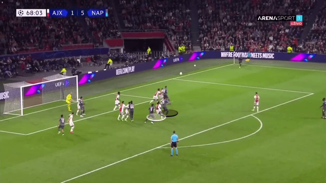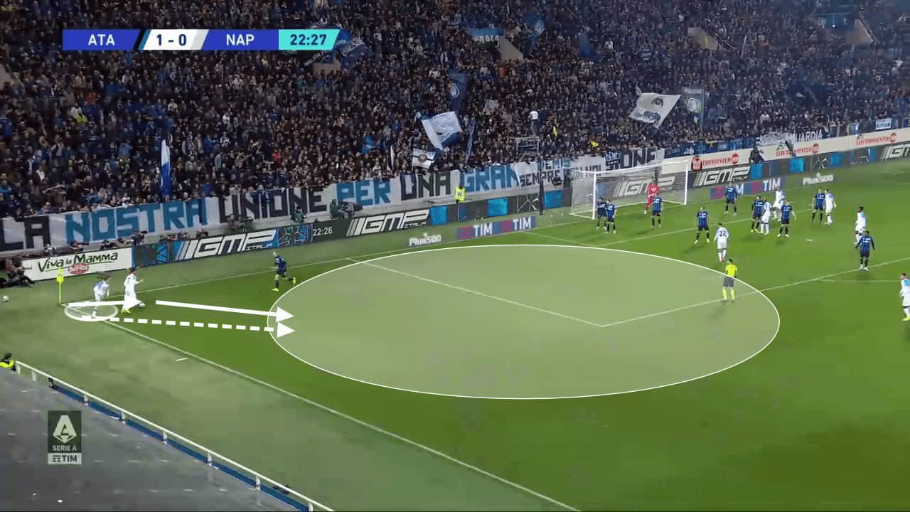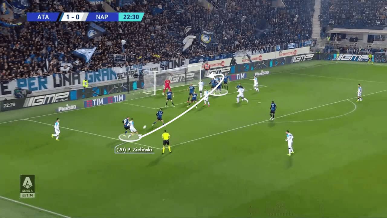 After playing a one-two, Zielinski arrives at the corner of the box, from where he can make a dangerous inswinging delivery towards the back post. An inswinging cross from the half-space can be one of the most deadly methods of chance creation, where goalkeepers are unsure whether they can come out, and even if a cross is missed by the attackers, it can still curl into the goal. From this scenario, Osimhen rises above every defender, and can easily redirect the ball into the back of the net from five yards or so.