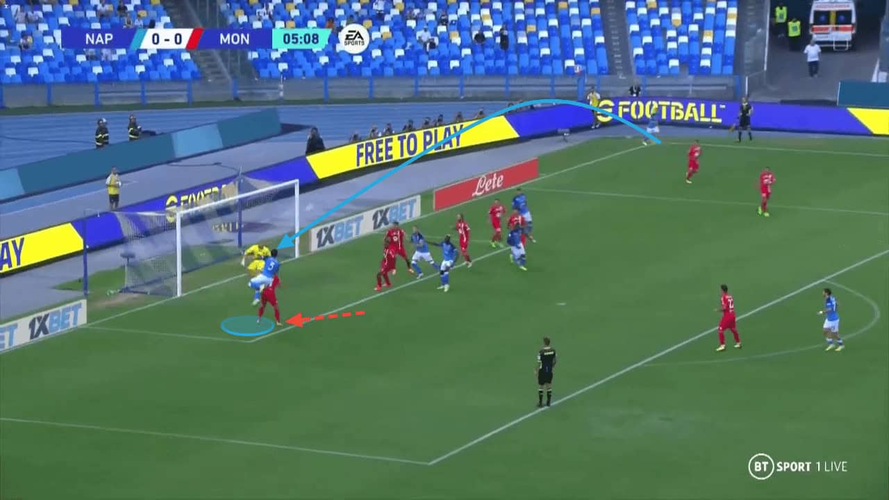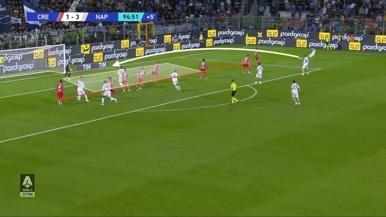 Like with the ‘underhit’ crosses, Napoli have attempted to target the area at the back post through decoy runs. In the earlier scenarios, the cross did indeed arrive at the near post originally, but in order to remain unpredictable, and perhaps due to the defender standing directly in front of the corner taker, Napoli have at times gone towards the back post directly. The defender standing in front of the ball prevents a flat low cross from easily reaching the front of the six-yard box, so the cross has to have a higher trajectory.
