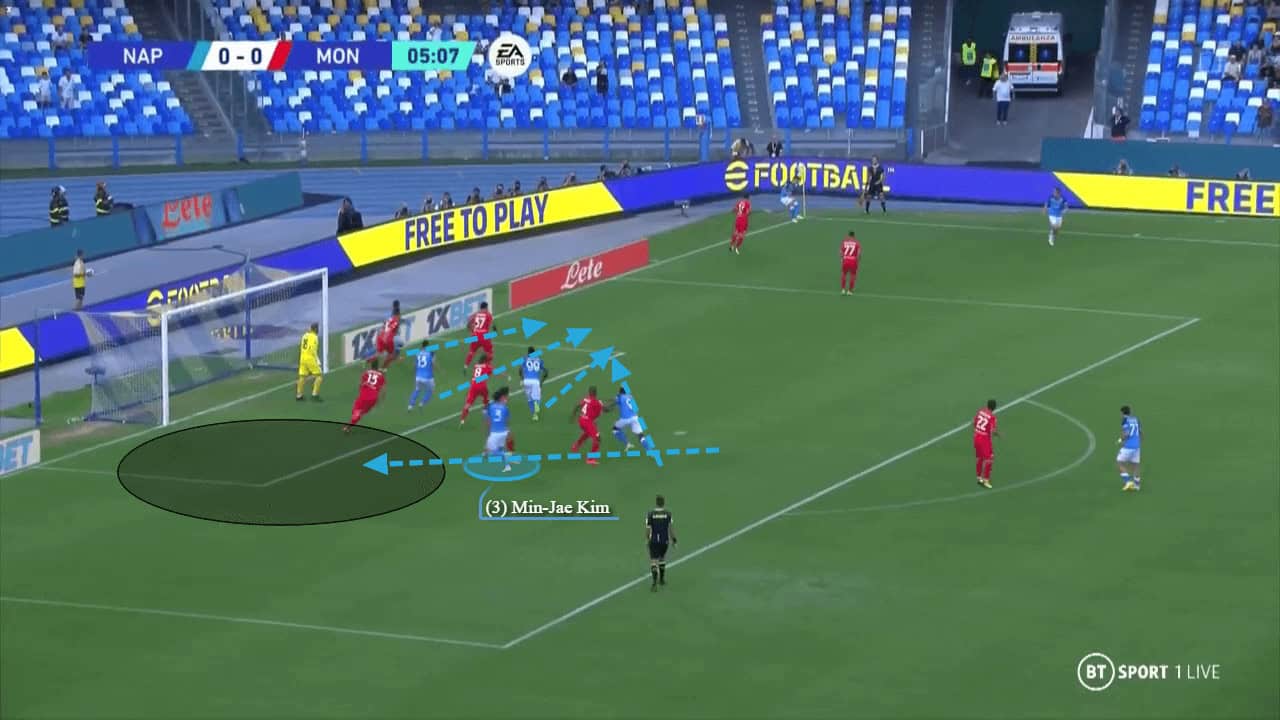 In these instances, Napoli have used a large number of decoy runs in order to create that space at the back post. The image below shows four different Napoli players all sprinting towards the front post. Against this man-marking system, it means that every defender has followed their runner to the front post. While every defender is dragged to the back post, Min-jae Kim attacks the back post.