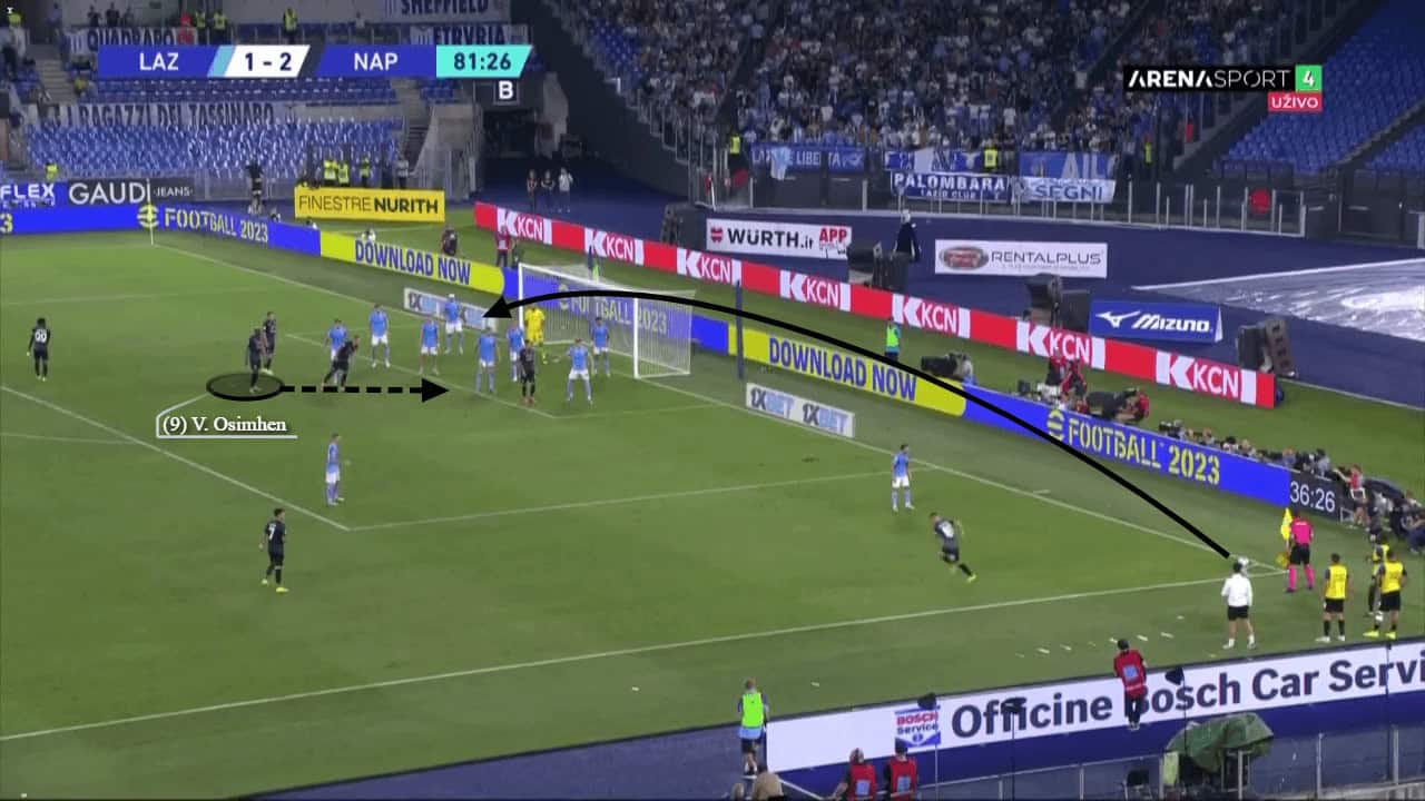A common weakness of zonal markers is their static position during the delivery, meaning that it is difficult to get the jumping reach of someone who is in motion. Napoli take advantage of that in the image below, where Osimhen has no one marking him and can attack a cross with a six-yard run-up. The ball is delivered towards the edge of the six-yard box, and the fact that Osimhen can attack the cross allows him to outjump the Lazio defender, and get to the header first, although the attempt ends up going off target.
