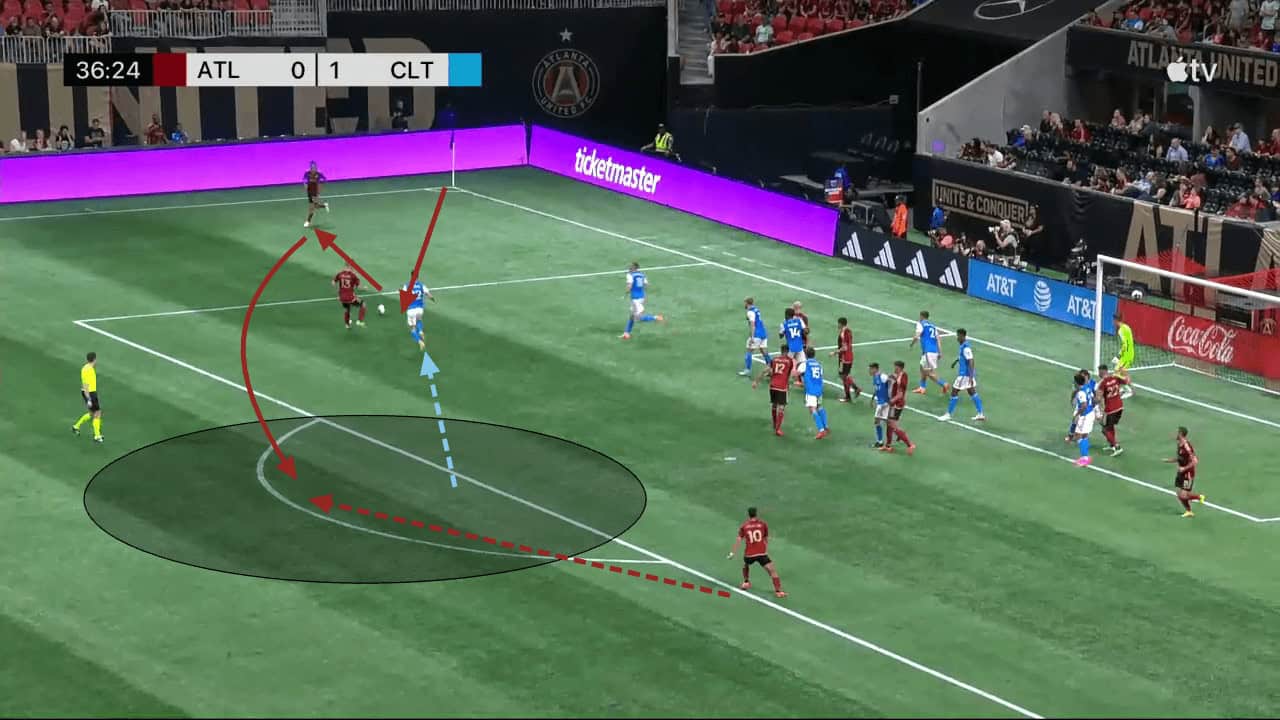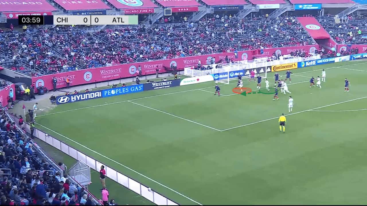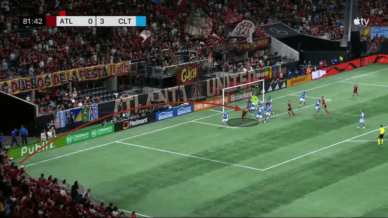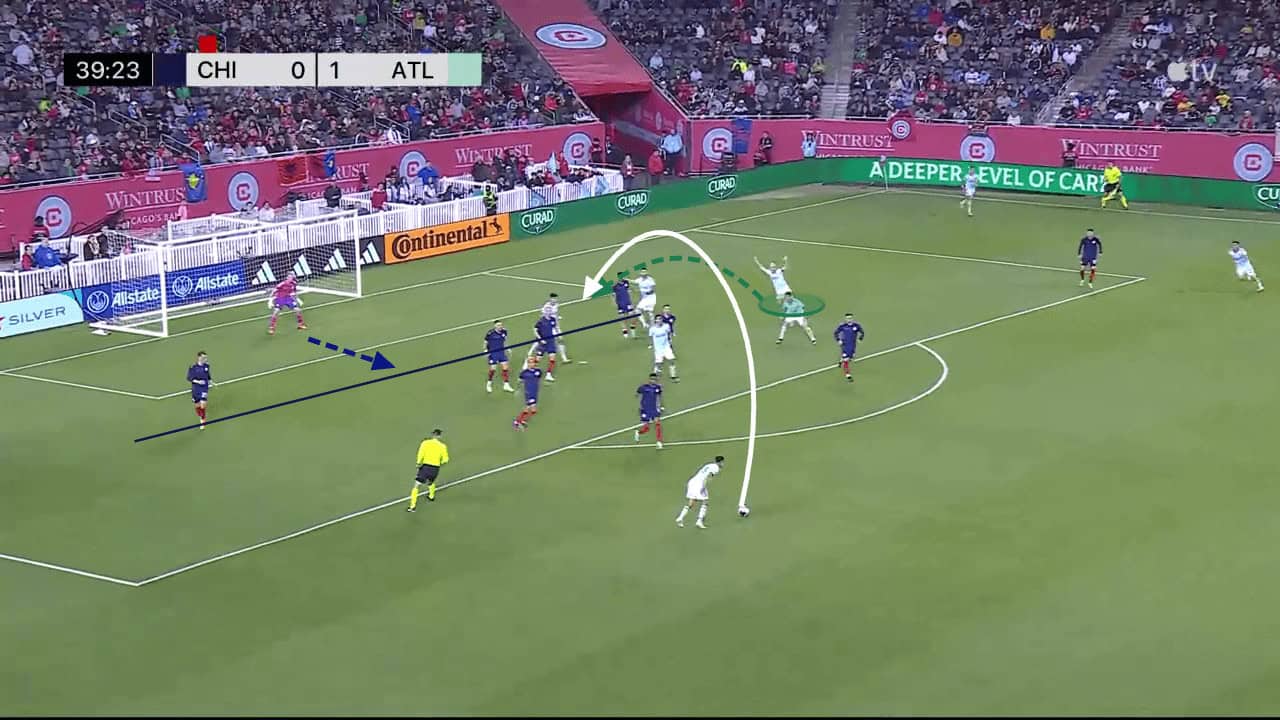 In this case, the hurried nature of defenders closing down the potential shot has left some attackers open in space which Almada uses to his advantage in order to deliver the ball into a more dangerous position inside the six-yard box. The lack of coordination in the defensive line stepping up is also used to Atlanta’s advantage where they move in the opposite direction to the Chicago Fire defenders to create additional space for themselves.